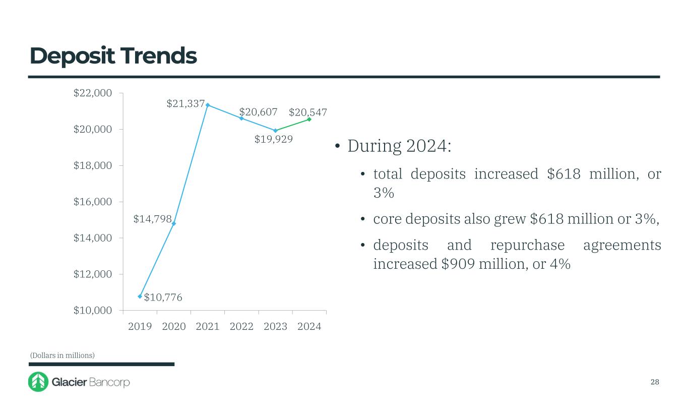$10,776 $14,798 $21,337 $20,607 $19,929 $20,547 $10,000 $12,000 $14,000 $16,000 $18,000 $20,000 $22,000 2019 2020 2021 2022 2023 2024 • During 2024: • total deposits increased $618 million, or 3% • core deposits also grew $618 million or 3%, • deposits and repurchase agreements increased $909 million, or 4% Deposit Trends (Dollars in millions) 28