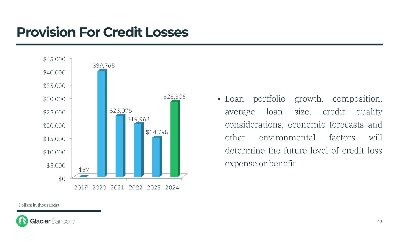 CECL and Allowance for Credit Losses (ACL) • Commercial Asset Quality Ratings • Consumer Loan Past Due Status • Additional Qualitative Adjustments • Prepayment Speed Assumptions • Low levels of unemployment • Historical Loss Period Capture (Dollars in millions) Other Key Model Inputs National Economic Assumptions (December 2024) 3Q 24 4Q 24 1Q 25 2024 2025 GDP Change 0.7% 0. 6% 0.6% 2.5% 2.5% Unemployment Rate 4.2% 4.2% 4.3% 4.1% 4.3% 1.19% of Total Loans 1.19% of Total Loans 42