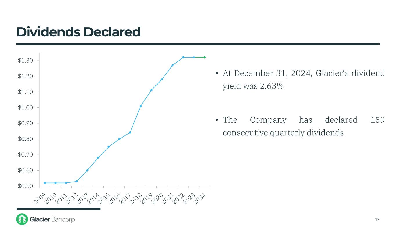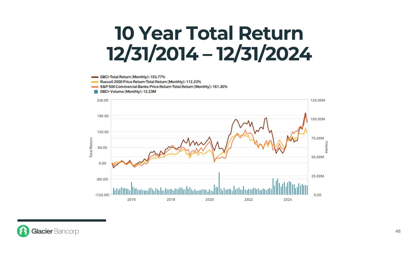 $0.50 $0.60 $0.70 $0.80 $0.90 $1.00 $1.10 $1.20 $1.30 • At December 31, 2024, Glacier’s dividend yield was 2.63% • The Company has declared 159 consecutive quarterly dividends Dividends Declared 47