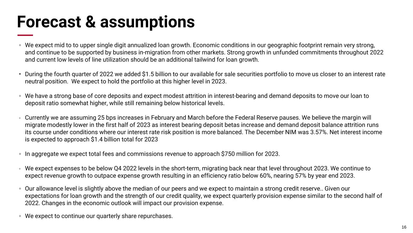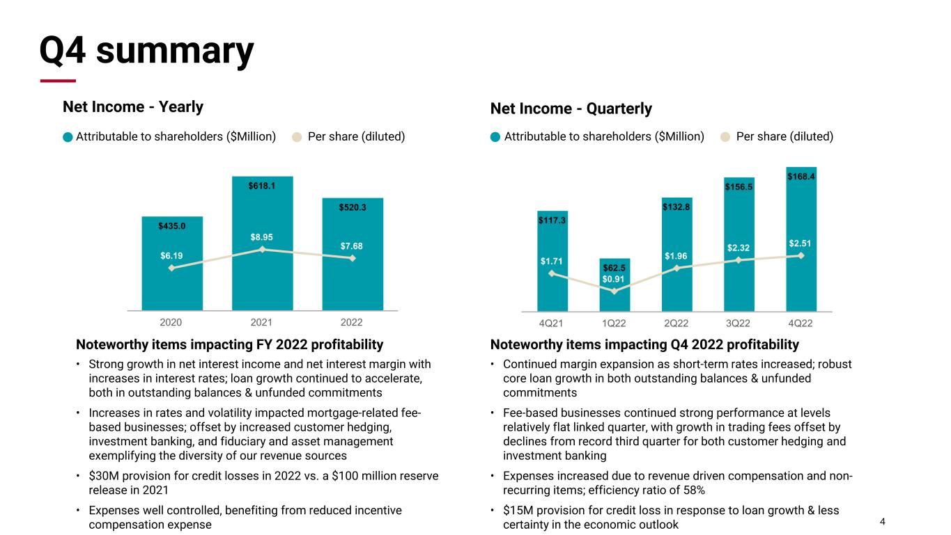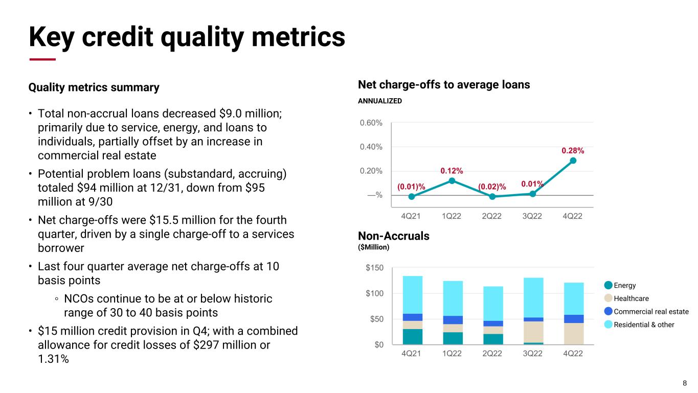 -2022年第4四半期に予想信用損失引当金を15.0百万ドル計上しましたが、これは主に貸付金と貸出コミットメントの大幅な増加によるものです。経済見通しの不確実性のレベルは依然として高く、主要な経済要因はすべてのシナリオで経済成長に対してやや不利なものとなっています。また、2022 年第 3 四半期に予想信用損失引当金を 1500 万ドル計上しましたが、これは主に当四半期の貸出金と貸出コミットメントの増加によるものです。2022 年 12 月 31 日時点の信用損失引当金は、合計で 2.97 億ドル、貸出残高の 1.31%でした。2022 年 9 月 30 日時点の信用損失引当金は、合計で 2 億 9800 万ドル、貸付残高の 1.37%でした。