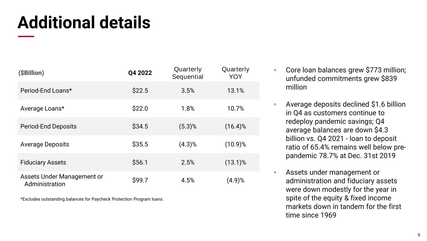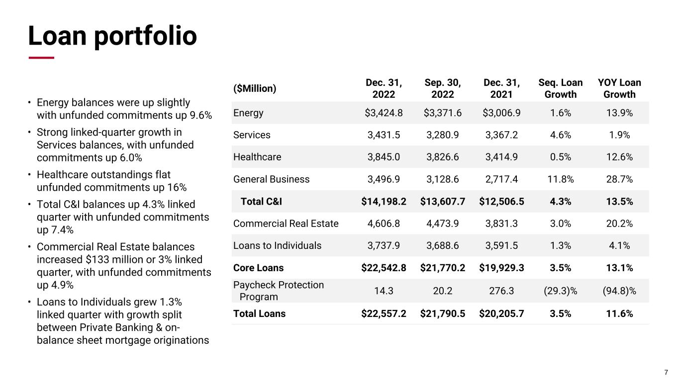 -期末貸出金は、2022 年 12 月 31 日時点で 24 億ドル増加し 226 億ドルとなりました。このうち、商業ローンは 17 億ドル、商業不動産ローンは 7.75 億ドル、個人向けローンは 1.46 億ドル増加しました。給与保障プログラム貸付金は2億6,200万ドル減少しました。平均貸出残高は213億ドルとなり、2億1600万ドル減少しました。