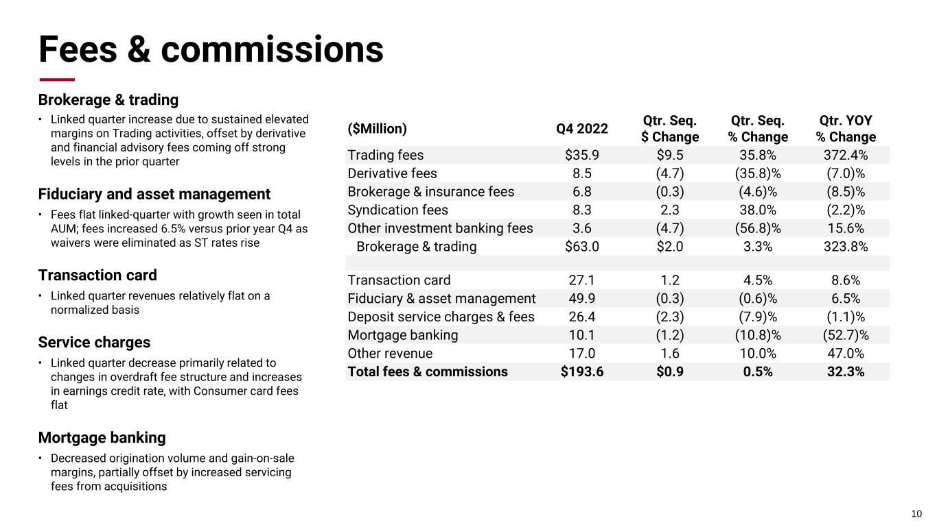 -手数料収入は、1,110 万ドル減少し、6 億 5,720 万ドルとなりました。住宅ローン金利の上昇と継続的な在庫不足による住宅ローン業務の収益の5,650万ドルの減少は、顧客ヘッ ジ、投資銀行業務、受託者および資産運用の収益の増加により、ほぼ相殺されました。