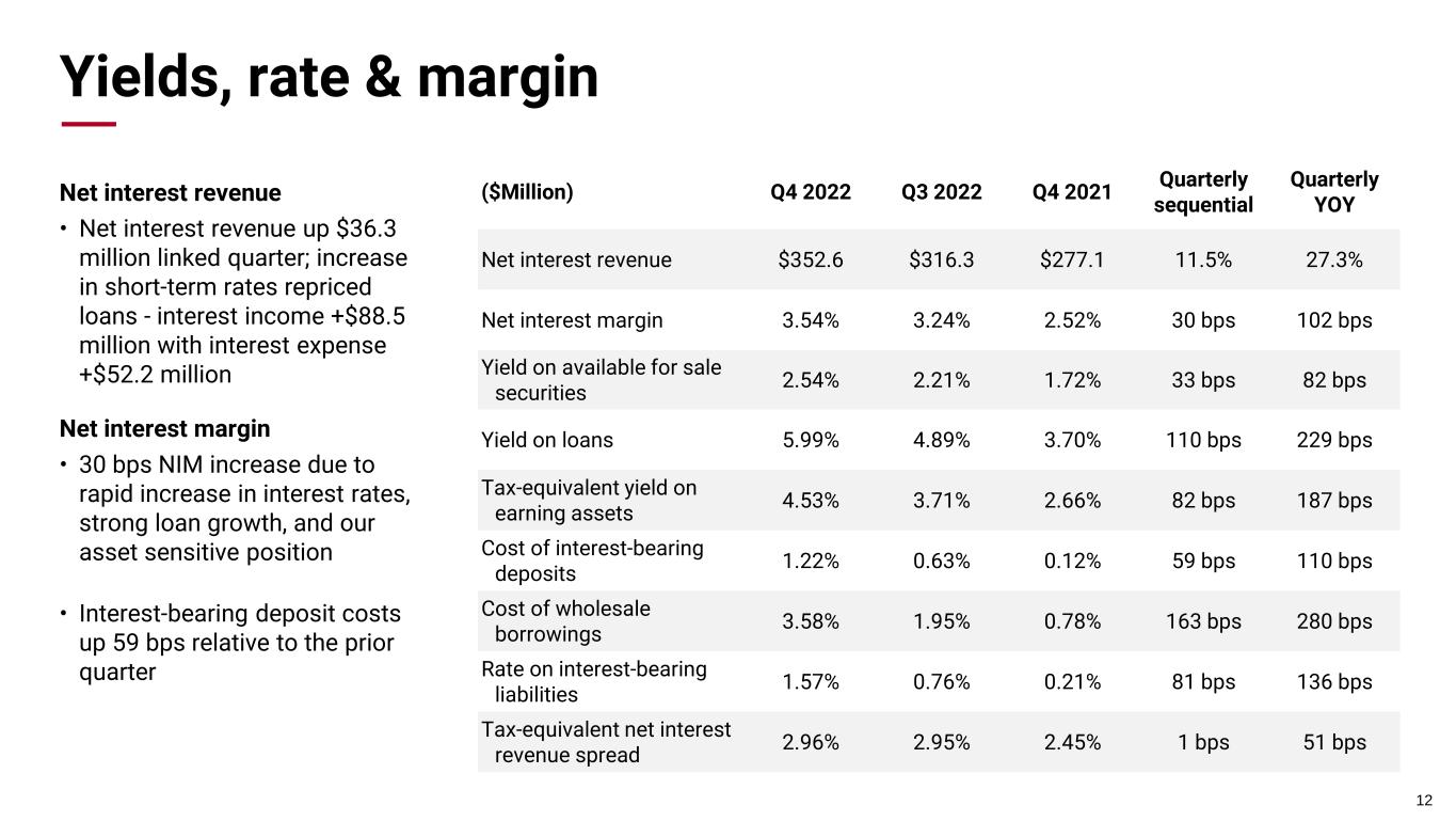 2022 年第 4 四半期の純金利収入は、3630 万ドル増加し、3 億 5260 万ドルとなりました。金利の急上昇に加え、好調なローンの伸びと資産に敏感なポジションにより、純金利収入は連動して増加し、純金利マージンは30ベーシスポイント増の3.54%となりました。インフレの上昇に対応して、連邦準備制度理事会は第4四半期に連邦預金金利を125ベーシスポイント引き上げ、年初来の利上げ幅は425ベーシスポイントとなりました。この結果、市場金利が上昇し、当社の収益性資産(変動金利の商業貸付金の比率が高い)が有利子負債 よりも高い水準で速いペースで価格変動し、純金利マージンが増加しました。