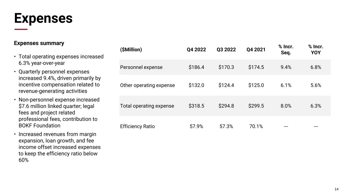 人件費以外の費用は1億3,200万ドルで、760万ドルの増加となりました。専門家報酬およびサービスの費用が430万ドル、データ処理および通信費用が130万ドル増加したのは、主に継続的な技術プロジェクトに起因するものです。また、2022 年第 4 四半期は、当社がサービスを提供する地域社会に引き続き焦点を当てるため、BOKF 財団への 250 万ドルの慈善寄付を行いました。