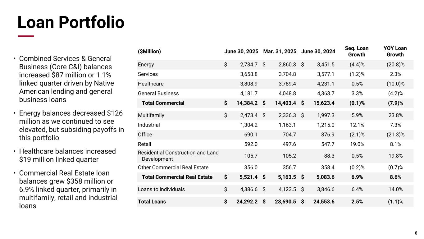 エネルギー・ローン残高は1億2600万ドル減少して27億ドルとなり、ローン総額の11%を占めた。このポートフォリオの大半は、石油・ガス生産者向けの第一抵当権付、シニア担保付、リザーブ・ベースの貸出で、エネルギー関連貸出の中では最もリスクが低いと考えています。コミットメント付き生産用ローンの約72%は、主に石油を生産する不動産が担保となっている。残りの28%は主に天然ガスを生産する不動産が担保となっている。2025年6月30日現在の未実行エネルギー・ローン・コミットメントは45億ドルで、2025年3月31日より8800万ドル増加した。