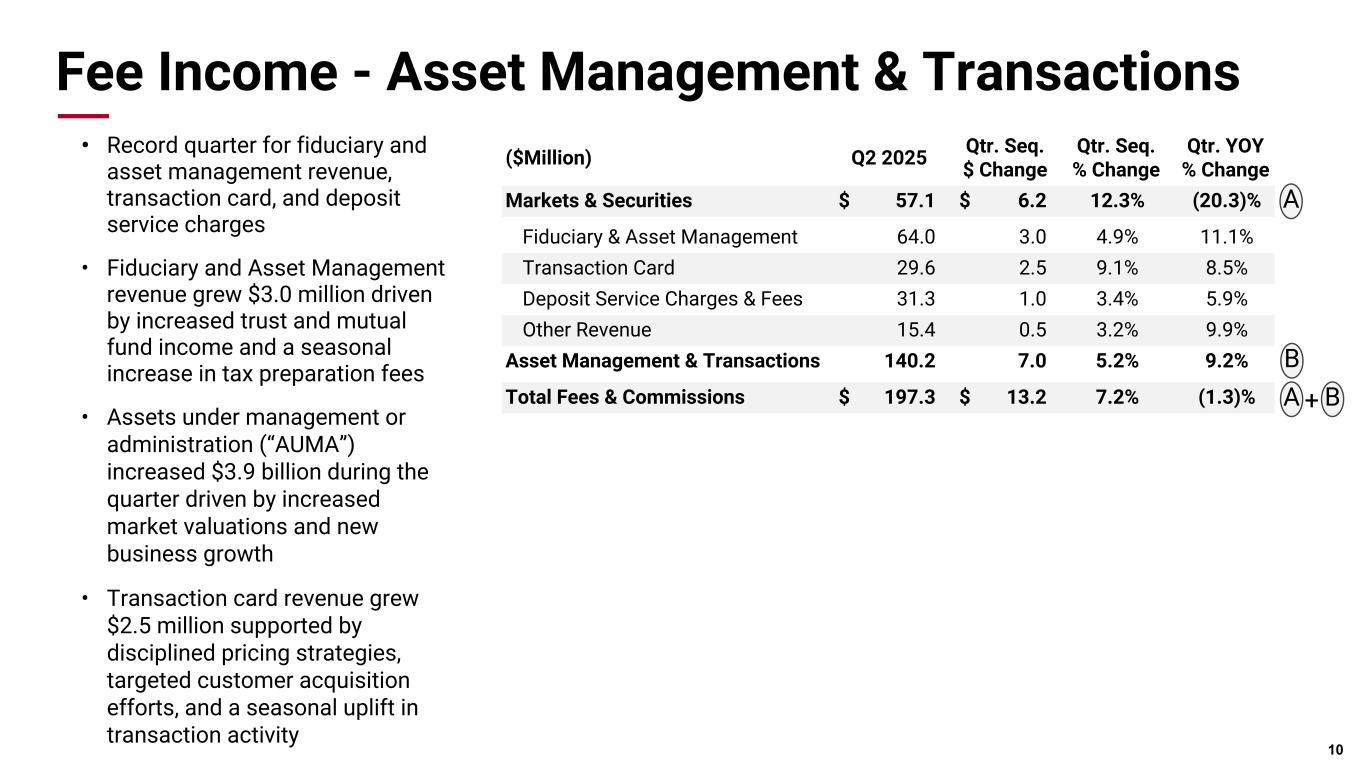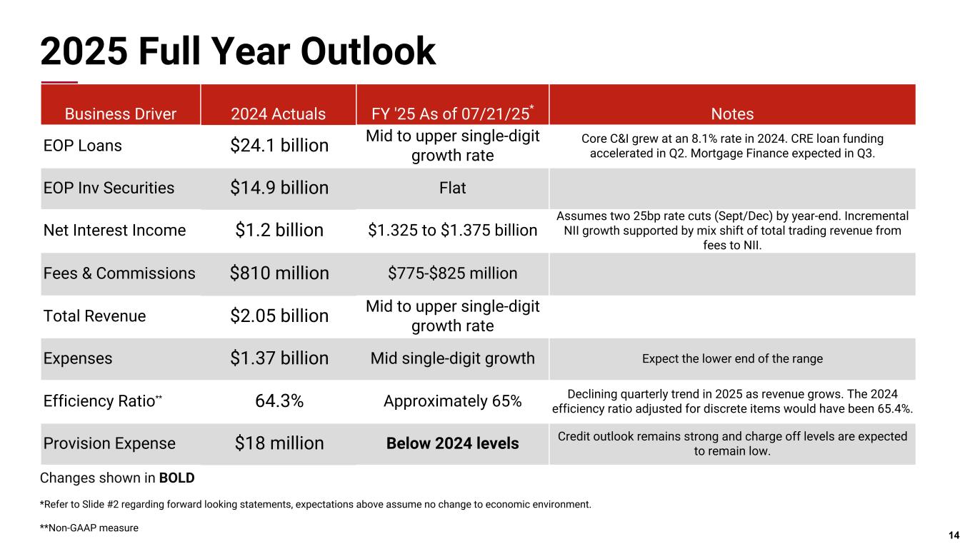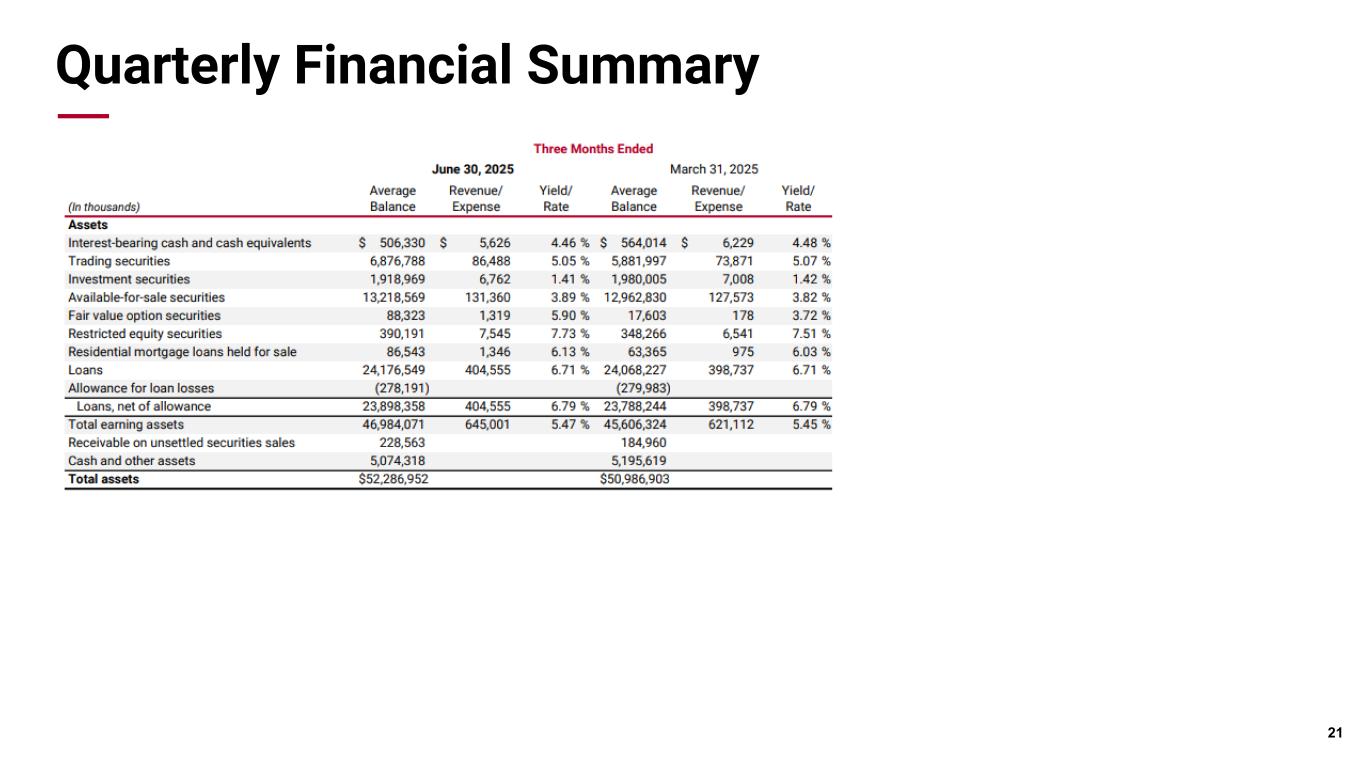 2025年6月30日現在の貸出残高は243億ドルで、2025年3月31日時点に比べ6億200万ドル増加したが、これは主に商業用不動産ローンおよび個人向けローンの増加によるものである。未実行貸出コミットメントは2025年第1四半期に比べ1億9,000万ドル増加した。