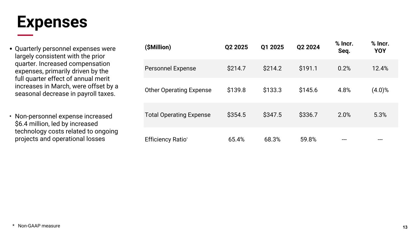 期末預金残高は比較的横ばいの382億ドルであったが、平均預金残高は2億2200万ドル減少して 381億ドルとなった。平均要求払い預金は1億9800万ドル減少し、平均利付預金は2500万ドル減少した。預貸率は2025年3月31日時点の62%に対し、6月30日時点では64%となった。 |