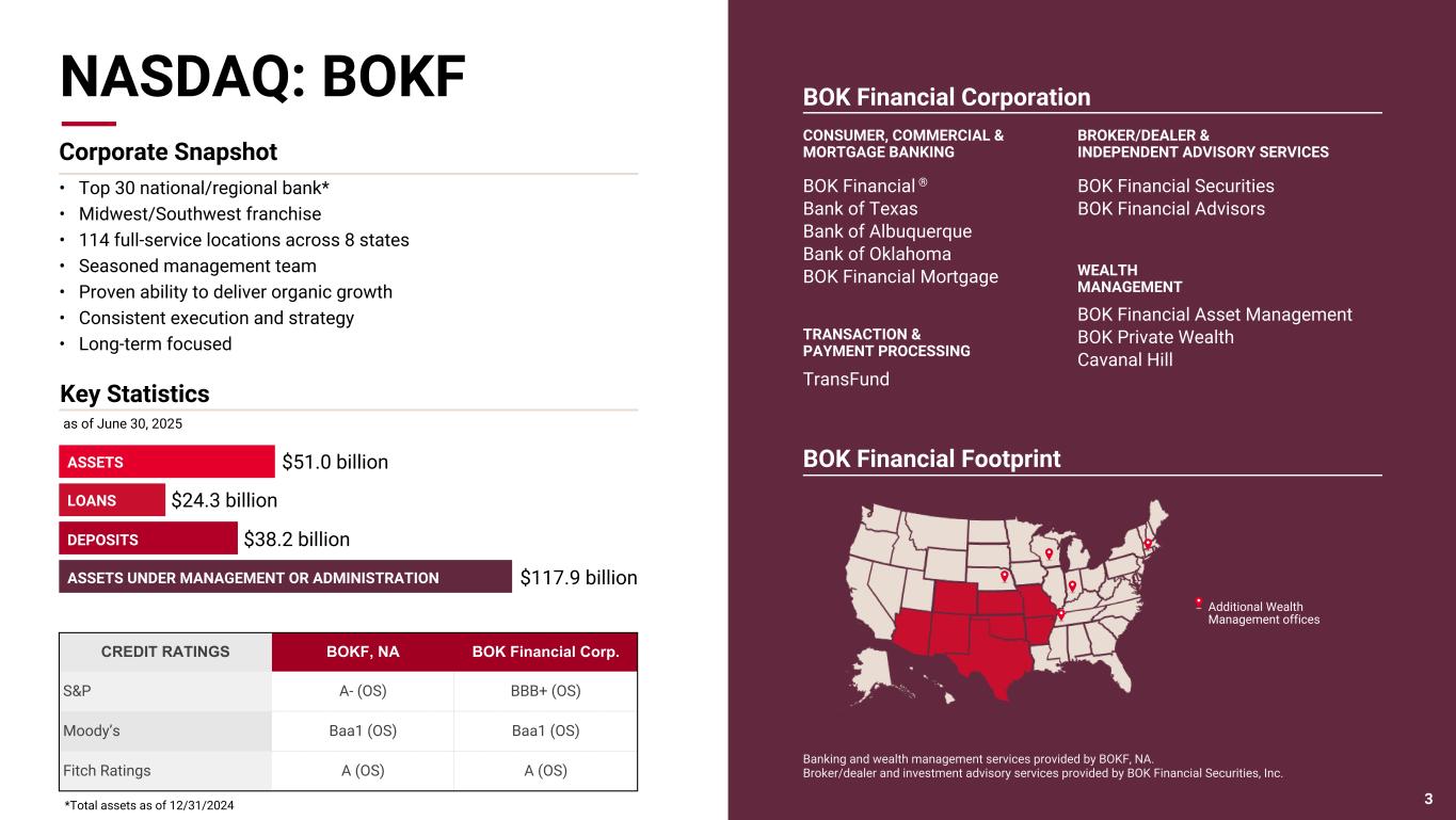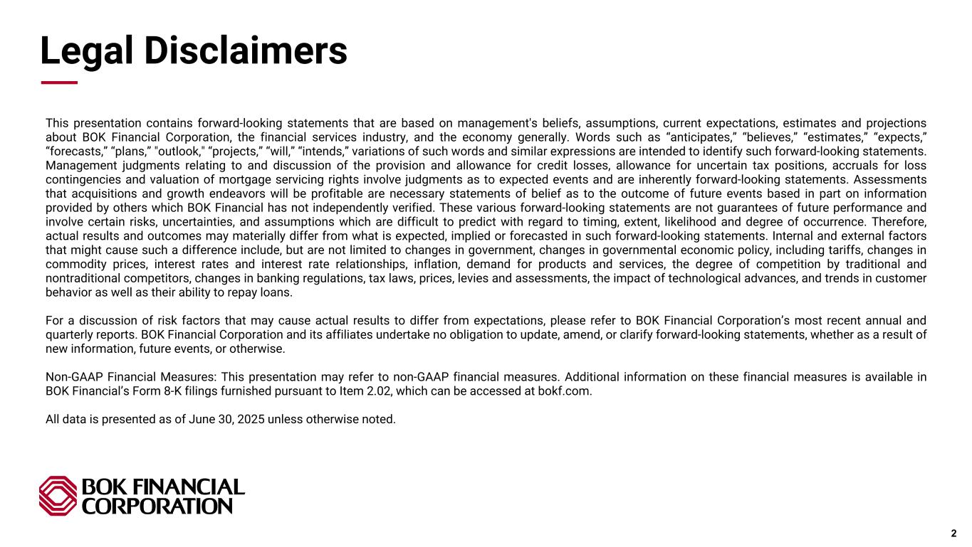 Pri m ar y & se co nd ar y br an d co lor s Data viz colors Data viz monochromatic Legal Disclaimers 2 This presentation contains forward-looking statements that are based on management's beliefs, assumptions, current expectations, estimates and projections about BOK Financial Corporation, the financial services industry, and the economy generally. Words such as “anticipates,” “believes,” “estimates,” “expects,” “forecasts,” “plans,” "outlook," “projects,” “will,” “intends,” variations of such words and similar expressions are intended to identify such forward-looking statements. Management judgments relating to and discussion of the provision and allowance for credit losses, allowance for uncertain tax positions, accruals for loss contingencies and valuation of mortgage servicing rights involve judgments as to expected events and are inherently forward-looking statements. Assessments that acquisitions and growth endeavors will be profitable are necessary statements of belief as to the outcome of future events based in part on information provided by others which BOK Financial has not independently verified. These various forward-looking statements are not guarantees of future performance and involve certain risks, uncertainties, and assumptions which are difficult to predict with regard to timing, extent, likelihood and degree of occurrence. Therefore, actual results and outcomes may materially differ from what is expected, implied or forecasted in such forward-looking statements. Internal and external factors that might cause such a difference include, but are not limited to changes in government, changes in governmental economic policy, including tariffs, changes in commodity prices, interest rates and interest rate relationships, inflation, demand for products and services, the degree of competition by traditional and nontraditional competitors, changes in banking regulations, tax laws, prices, levies and assessments, the impact of technological advances, and trends in customer behavior as well as their ability to repay loans. For a discussion of risk factors that may cause actual results to differ from expectations, please refer to BOK Financial Corporation’s most recent annual and quarterly reports. BOK Financial Corporation and its affiliates undertake no obligation to update, amend, or clarify forward-looking statements, whether as a result of new information, future events, or otherwise. Non-GAAP Financial Measures: This presentation may refer to non-GAAP financial measures. Additional information on these financial measures is available in BOK Financial’s Form 8-K filings furnished pursuant to Item 2.02, which can be accessed at bokf.com. All data is presented as of June 30, 2025 unless otherwise noted.