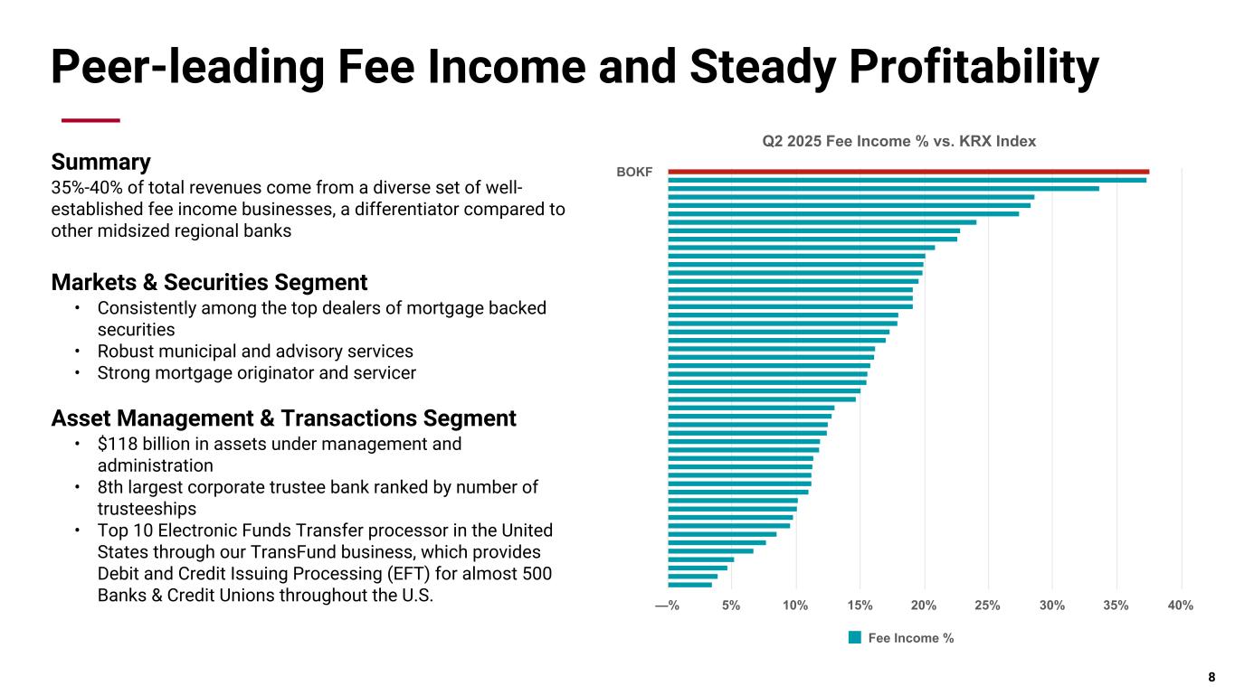 Pri m ar y & se co nd ar y br an d co lor s Data viz colors Data viz monochromatic Dec '22 Dec '23 Dec '24 Jun'25 $— $5,000 $10,000 $15,000 $20,000 $25,000 $30,000 $35,000 $40,000 $45,000 Strong Core Deposit Franchise Deposit Mix & Cost ($Millions) Deposit Mix by Geography 4% 53% 9% 5% 6% 23% Demand Interest-bearing transaction Savings Time 7 Source: Company filings, S&P Global Market Intelligence Deposit Mix by Line of Business Total Deposit Breakdown 29% 49% 19% 3% Wealth Commercial Consumer Small Business Commercial Deposit Breakdown 36% 24% 20% 10% 6% 4% Corporate Small/Med. Business Energy Native American Healthcare CRE IB Deposit Cost (%) 3.20%3.68%2.79%0.53% 39% 54% 4% 3% 27% 62% 2%9% 22% 67% 9% 2% 21% 68% 2% 9%