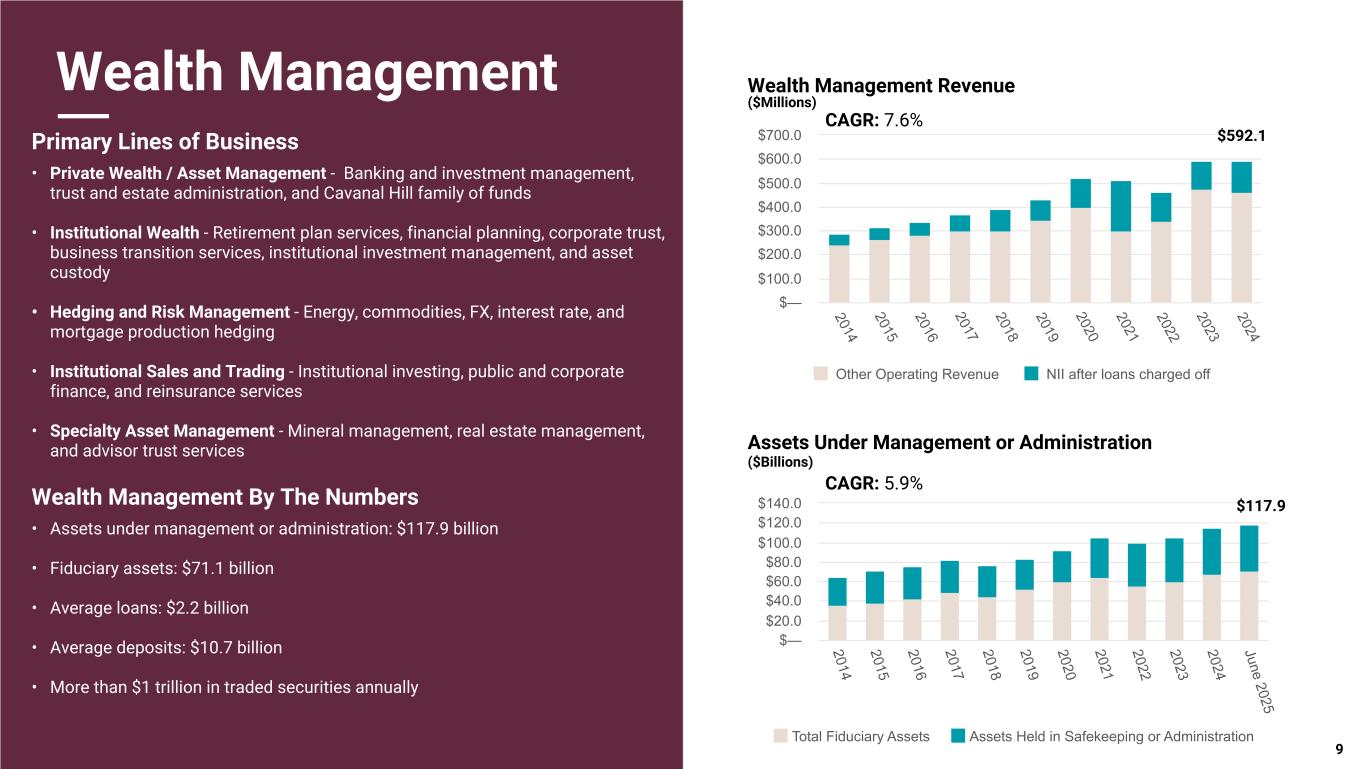 Pri m ar y & se co nd ar y br an d co lor s Data viz colors Data viz monochromatic Wealth Management Primary Lines of Business • Private Wealth / Asset Management - Banking and investment management, trust and estate administration, and Cavanal Hill family of funds • Institutional Wealth - Retirement plan services, financial planning, corporate trust, business transition services, institutional investment management, and asset custody • Hedging and Risk Management - Energy, commodities, FX, interest rate, and mortgage production hedging • Institutional Sales and Trading - Institutional investing, public and corporate finance, and reinsurance services • Specialty Asset Management - Mineral management, real estate management, and advisor trust services Wealth Management By The Numbers • Assets under management or administration: $117.9 billion • Fiduciary assets: $71.1 billion • Average loans: $2.2 billion • Average deposits: $10.7 billion • More than $1 trillion in traded securities annually Assets Under Management or Administration ($Billions) Wealth Management Revenue ($Millions) 9 Total Fiduciary Assets Assets Held in Safekeeping or Administration 2014 2015 2016 2017 2018 2019 2020 2021 2022 2023 2024 June 2025 $— $20.0 $40.0 $60.0 $80.0 $100.0 $120.0 $140.0 CAGR: 5.9% Other Operating Revenue NII after loans charged off 2014 2015 2016 2017 2018 2019 2020 2021 2022 2023 2024 $— $100.0 $200.0 $300.0 $400.0 $500.0 $600.0 $700.0 CAGR: 7.6% $592.1 $117.9