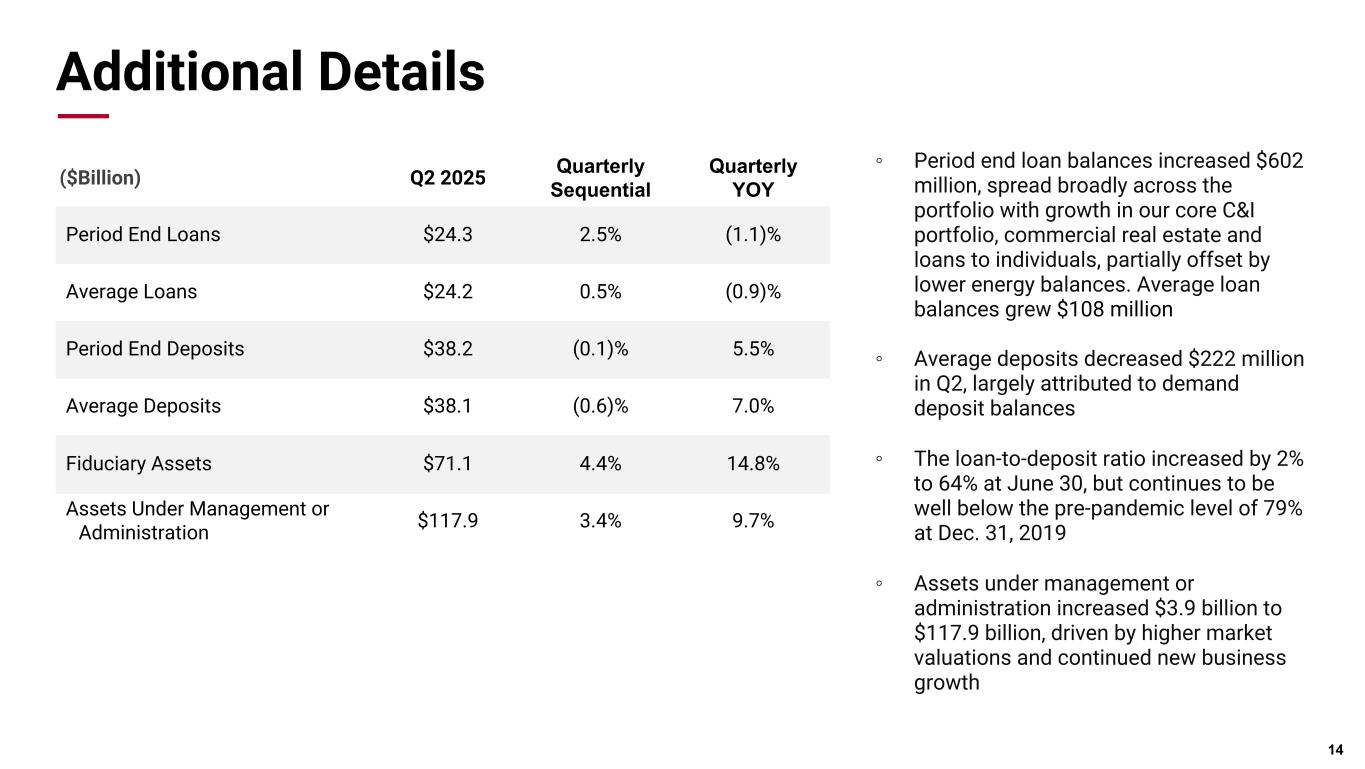 Pri m ar y & se co nd ar y br an d co lor s Data viz colors Data viz monochromatic Q2 Financial Highlights * Non-GAAP measure **Q2 2024 net income adjusted for the Visa B gain and related contribution to the BOKF Foundation and the additional FDIC special assessment expense would have been $131.1 million and EPS of $2.02 per share (Non-GAAP measure. Refer to Form 8-K furnished on July 22, 2024) Attributable to shareholders Per share (diluted) Net Income • Net Income was $140.0 million, or $2.19 per diluted share • Net interest margin expanded 2 basis points to 2.80% and core net interest margin, excluding trading, grew 7 basis points to 3.12%* • Period end loans grew $602 million or 2.5% to $24.3 billion with growth in our core C&I portfolio, commercial real estate, and loans to individuals, partially offset by a decease in energy balances • Asset quality remains very strong with non-performing assets, excluding loans guaranteed by U.S. government agencies, totaling $74 million or 0.31% of outstanding loans and repossessed assets. Net charge-offs were $561 thousand during Q2 • Continued strong capital and liquidity position with TCE reaching 9.6% during the quarter and a loan to deposit ratio of 64% 13 $163.7 $140.0 $136.2 $119.8 $140.0 $2.54 $2.18 $2.12 $1.86 $2.19 2Q24 3Q24 4Q24 1Q25 2Q25 ($Million, exc. EPS) Q2 2025 Q1 2025 Q2 2024** Net income $140.0 $119.8 $163.7 Diluted EPS $2.19 $1.86 $2.54 Net income before taxes $180.8 $154.8 $211.0 Provision for credit losses $0.0 $0.0 $8.0 Pre-provision net revenue* $180.7 $154.8 $219.0 Efficiency ratio* 65.4% 68.3% 59.8% Revenue Composition as of 6/30/2025 62% 7% 12% 6% 6% 4% 3% Net Interest Income Trading & Brokerage Fiduciary & Asset Management Transaction Card Deposit Service Charges Mortgage Banking Other Revenue