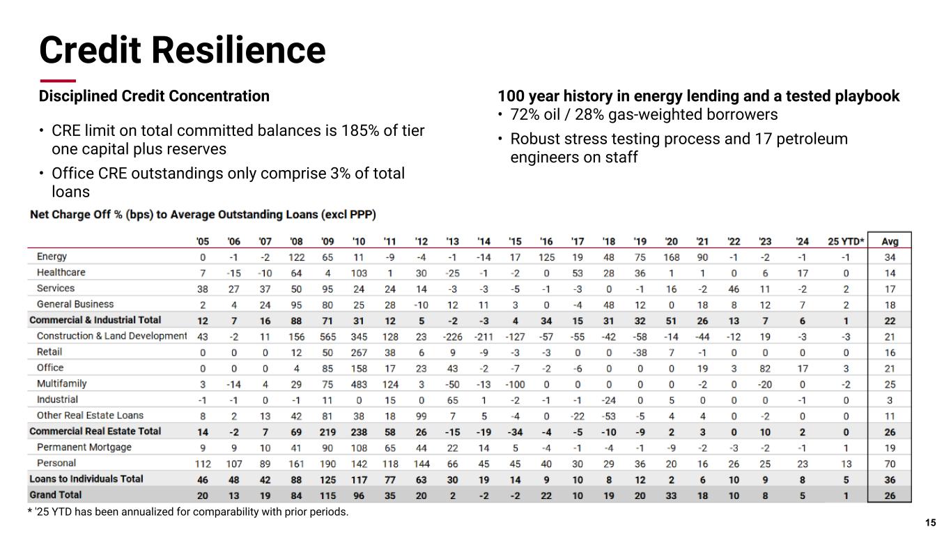 Pri m ar y & se co nd ar y br an d co lor s Data viz colors Data viz monochromatic Credit Resilience Disciplined Credit Concentration • CRE limit on total committed balances is 185% of tier one capital plus reserves • Office CRE outstandings only comprise 3% of total loans 15 100 year history in energy lending and a tested playbook • 72% oil / 28% gas-weighted borrowers • Robust stress testing process and 17 petroleum engineers on staff * '25 YTD has been annualized for comparability with prior periods.