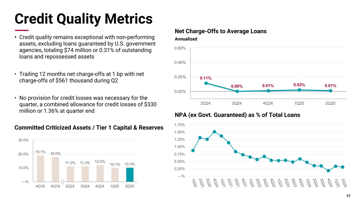 Pri m ar y & se co nd ar y br an d co lor s Data viz colors Data viz monochromatic Credit Quality Metrics • Credit quality remains exceptional with non-performing assets, excluding loans guaranteed by U.S. government agencies, totaling $74 million or 0.31% of outstanding loans and repossessed assets • Trailing 12 months net charge-offs at 1 bp with net charge-offs of $561 thousand during Q2 • No provision for credit losses was necessary for the quarter, a combined allowance for credit losses of $330 million or 1.36% at quarter end Net Charge-Offs to Average Loans NPA (ex Govt. Guaranteed) as % of Total Loans Annualized 17 0.11% 0.00% 0.01% 0.02% 0.01% 2Q24 3Q24 4Q24 1Q25 2Q25 0.00% 0.20% 0.40% 0.60% 19.1% 18.0% 11.2% 11.3% 12.0% 10.1% 10.3% 4Q18 4Q19 2Q24 3Q24 4Q24 1Q25 2Q25 —% 10.0% 20.0% 30.0% Committed Criticized Assets / Tier 1 Capital & Reserves 1Q 20 2Q 20 3Q 20 4Q 20 1Q 21 2Q 21 3Q 21 4Q 21 1Q 22 2Q 22 3Q 22 4Q 22 1Q 23 2Q 23 3Q 23 4Q 23 1Q 24 2Q 24 3Q 24 4Q 24 1Q 25 2Q 25 —% 0.25% 0.50% 0.75% 1.00% 1.25% 1.50% 1.75%