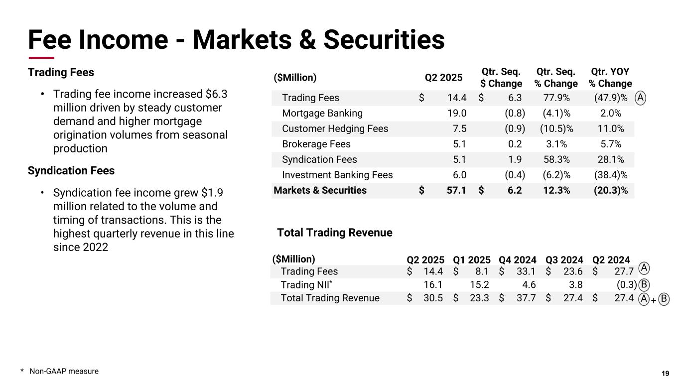 Pri m ar y & se co nd ar y br an d co lor s Data viz colors Data viz monochromatic Yields, Rate & Margin Net Interest Income • Net interest income was up $11.9 million linked quarter, driven by the continued upward repricing of fixed-rate securities and loans. Core net interest income, excluding trading, increased $11.0 million* Net Interest Margin • 2 basis points NIM increase with core net interest margin, excluding trading, increasing 7 basis points* 18 ($Million) Q2 2025 Q1 2025 Q2 2024 Quarterly sequential Quarterly YOY Net Interest Income $328.2 $316.3 $296.0 3.8% 10.9% Net Interest Margin 2.80% 2.78% 2.56% 2 bps 24 bps Yield on Loans 6.71% 6.71% 7.41% 0 bps (70) bps Tax-equivalent Yield on Earning Assets 5.47% 5.45% 5.80% 2 bps (33) bps Cost of Interest-bearing Deposits 3.17% 3.24% 3.76% (7) bps (59) bps Rate on Interest- bearing Liabilities 3.40% 3.42% 4.15% (2) bps (75) bps Net Interest Income ($Million) $296.3 $304.4 $308.4 $301.1 $312.0 $(0.3) $3.8 $4.6 $15.2 $16.1 NII excl. Trading * Trading NII 2Q24 3Q24 4Q24 1Q25 2Q25 $0 $100 $200 $300 $400 2.56% 2.68% 2.75% 2.78% 2.80% 2.94% 3.02% 3.09% 3.05% 3.12% Reported NIM NIM excl. Trading * 2Q24 3Q24 4Q24 1Q25 2Q25 2.50% 3.00% 3.50% 4.00% Net Interest Margin * Non-GAAP measure