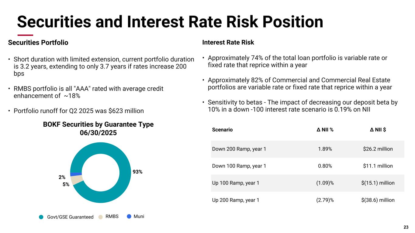 Pri m ar y & se co nd ar y br an d co lor s Data viz colors Data viz monochromatic Securities and Interest Rate Risk Position Interest Rate Risk • Approximately 74% of the total loan portfolio is variable rate or fixed rate that reprice within a year • Approximately 82% of Commercial and Commercial Real Estate portfolios are variable rate or fixed rate that reprice within a year • Sensitivity to betas - The impact of decreasing our deposit beta by 10% in a down -100 interest rate scenario is 0.19% on NII 23 Scenario Δ NII % Δ NII $ Down 200 Ramp, year 1 1.89% $26.2 million Down 100 Ramp, year 1 0.80% $11.1 million Up 100 Ramp, year 1 (1.09)% $(15.1) million Up 200 Ramp, year 1 (2.79)% $(38.6) million Securities Portfolio • Short duration with limited extension, current portfolio duration is 3.2 years, extending to only 3.7 years if rates increase 200 bps • RMBS portfolio is all "AAA" rated with average credit enhancement of ~18% • Portfolio runoff for Q2 2025 was $623 million 93% 5% 2% Govt/GSE Guaranteed RMBS Muni BOKF Securities by Guarantee Type 06/30/2025