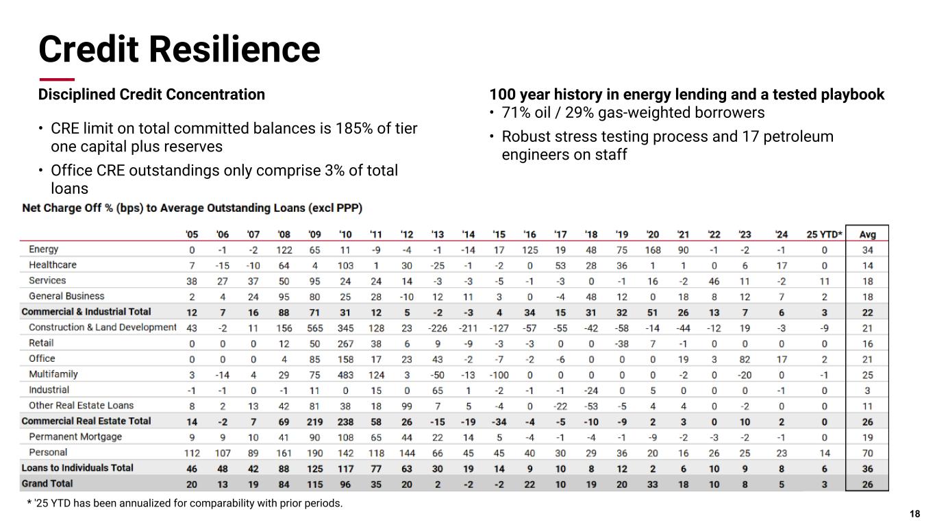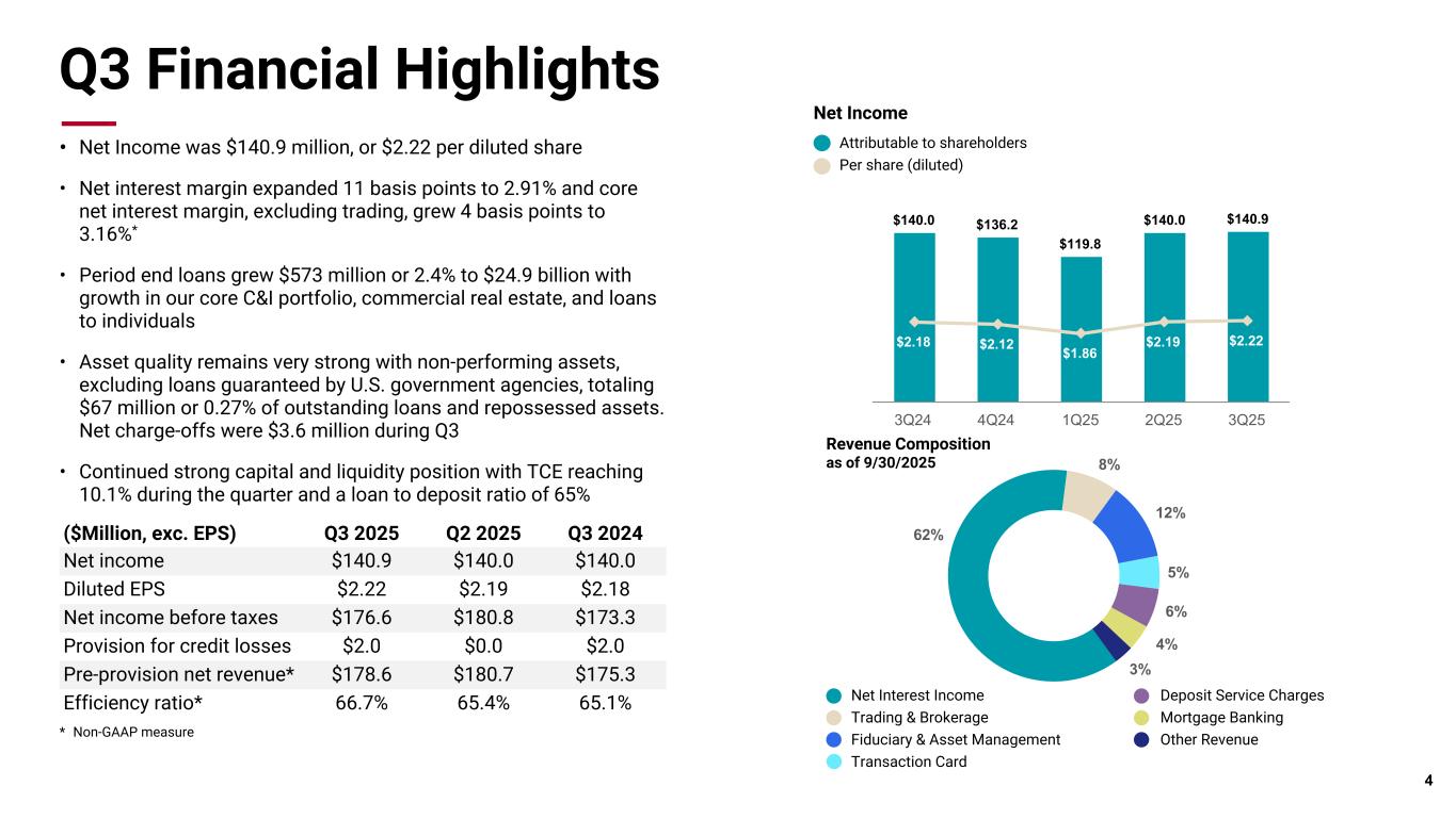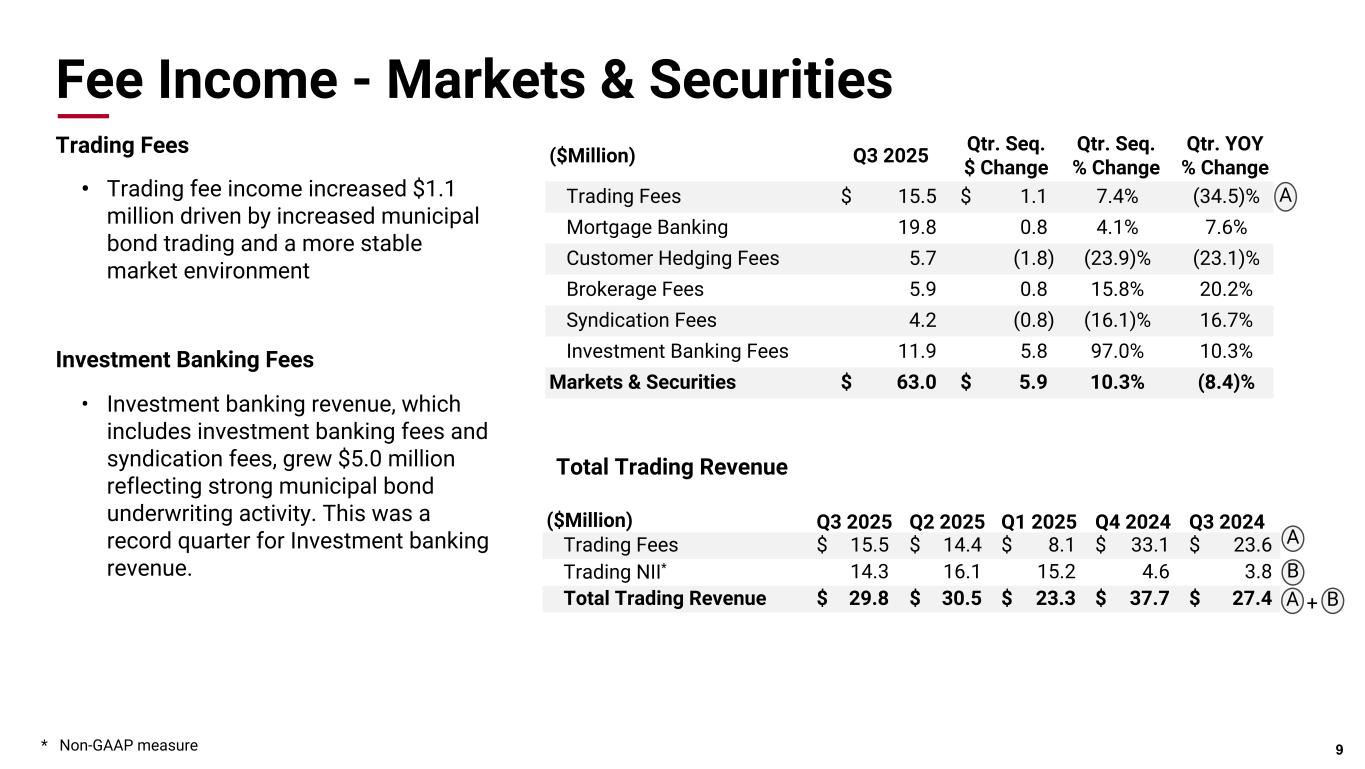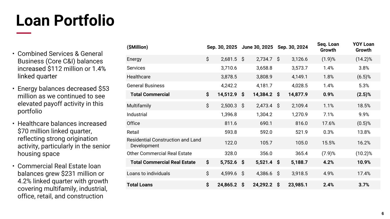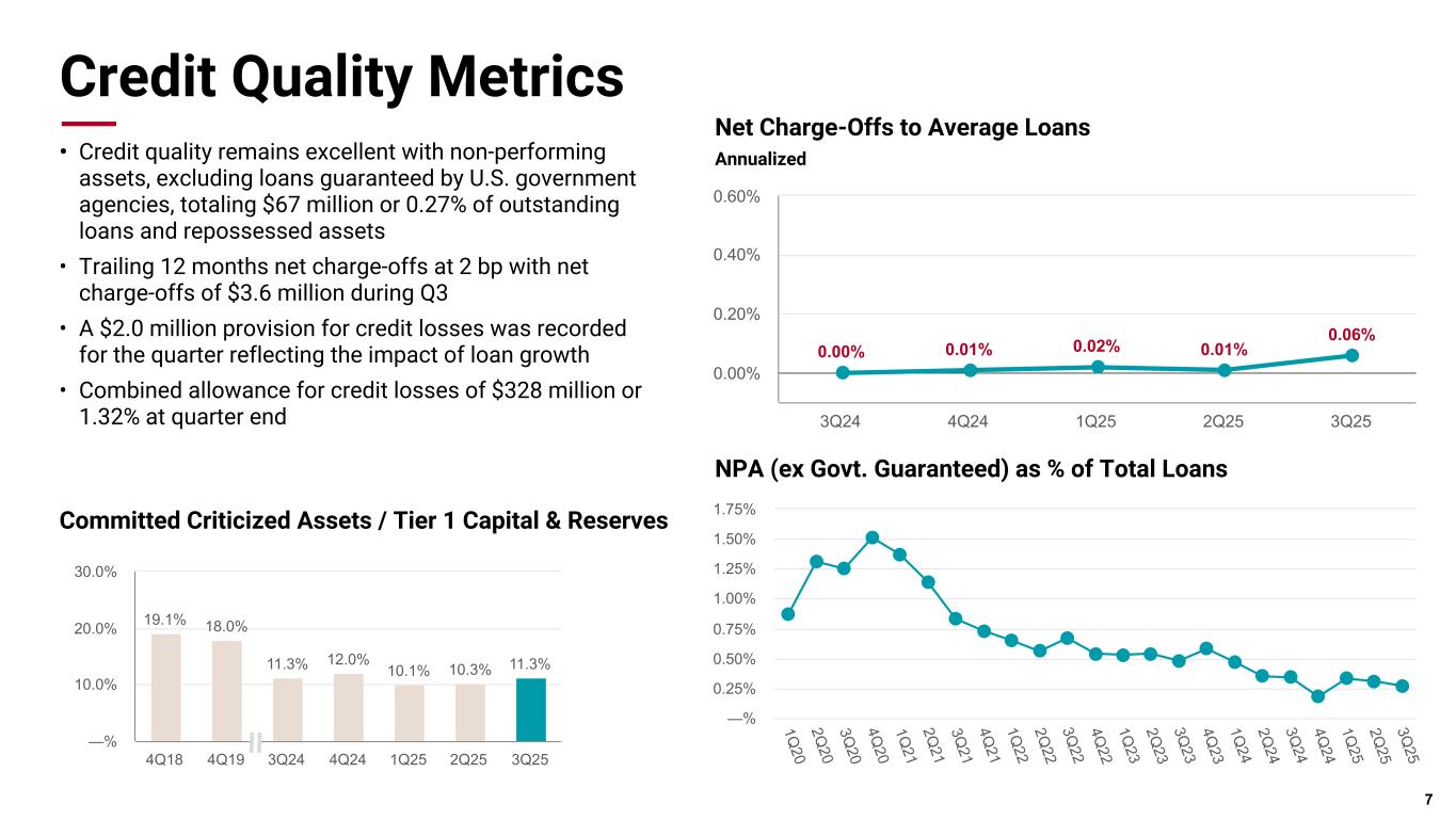 Credit Quality 不良資産は、2025年6月30日時点の8,100万ドル(0.33%)から、9月30日時点では7,400万ドル(ローン残高および差し押さえ資産の0.30%)に減少した。第 3 四半期の正味償却額は 360 万ドル、年率換算で平均貸出額の 0.06%でした。
