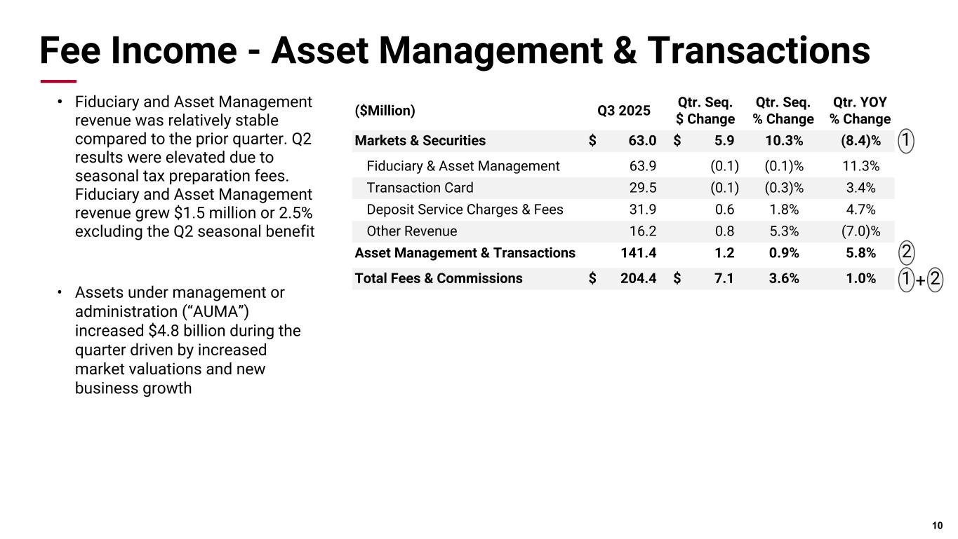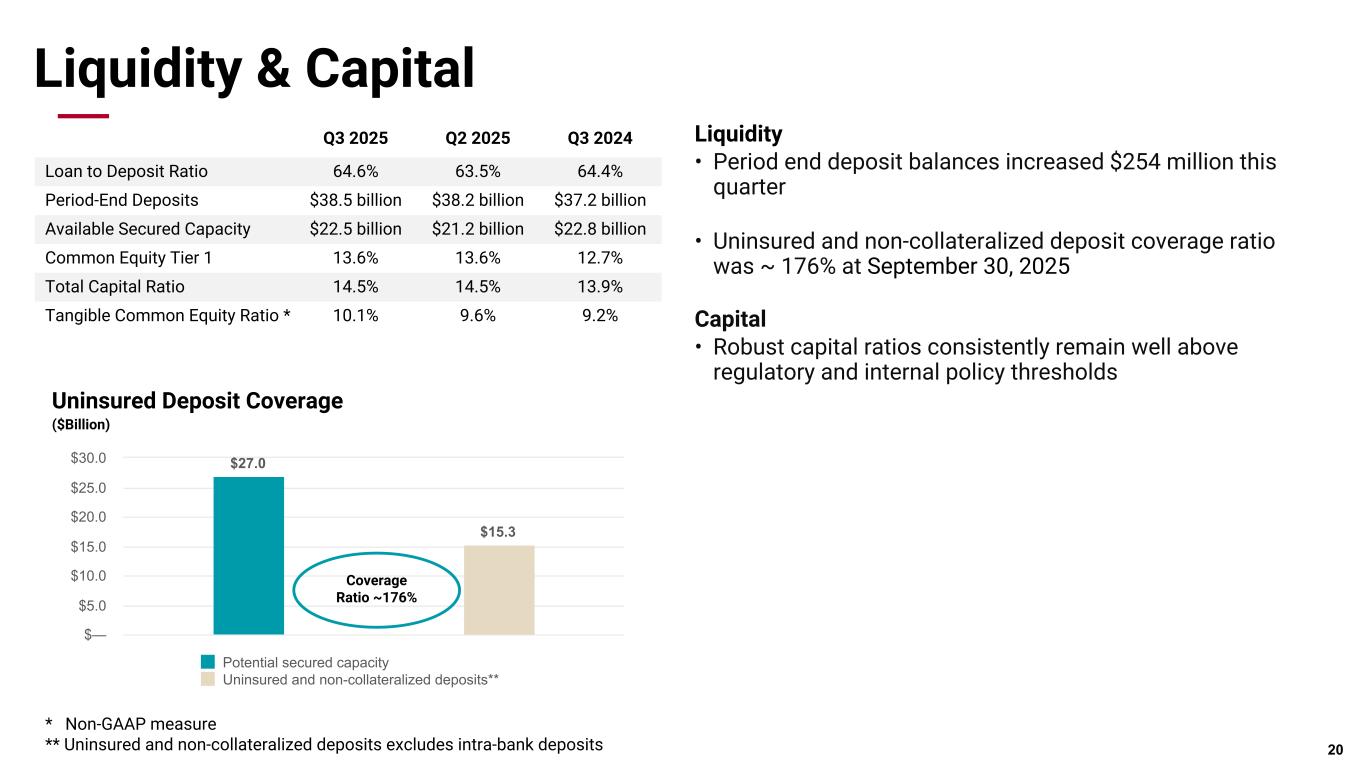 Deposits 期末預金残高は2億5,400万ドル増の385億ドル、平均預金残高は3億4,500万ドル増の385億ドルとなった。平均利付預金は4億800万ドル増加したが、平均要求払預金は6400万ドル減少した。預貸率は2025年6月30日時点の64%に対し、9月30日時点では65%であった。