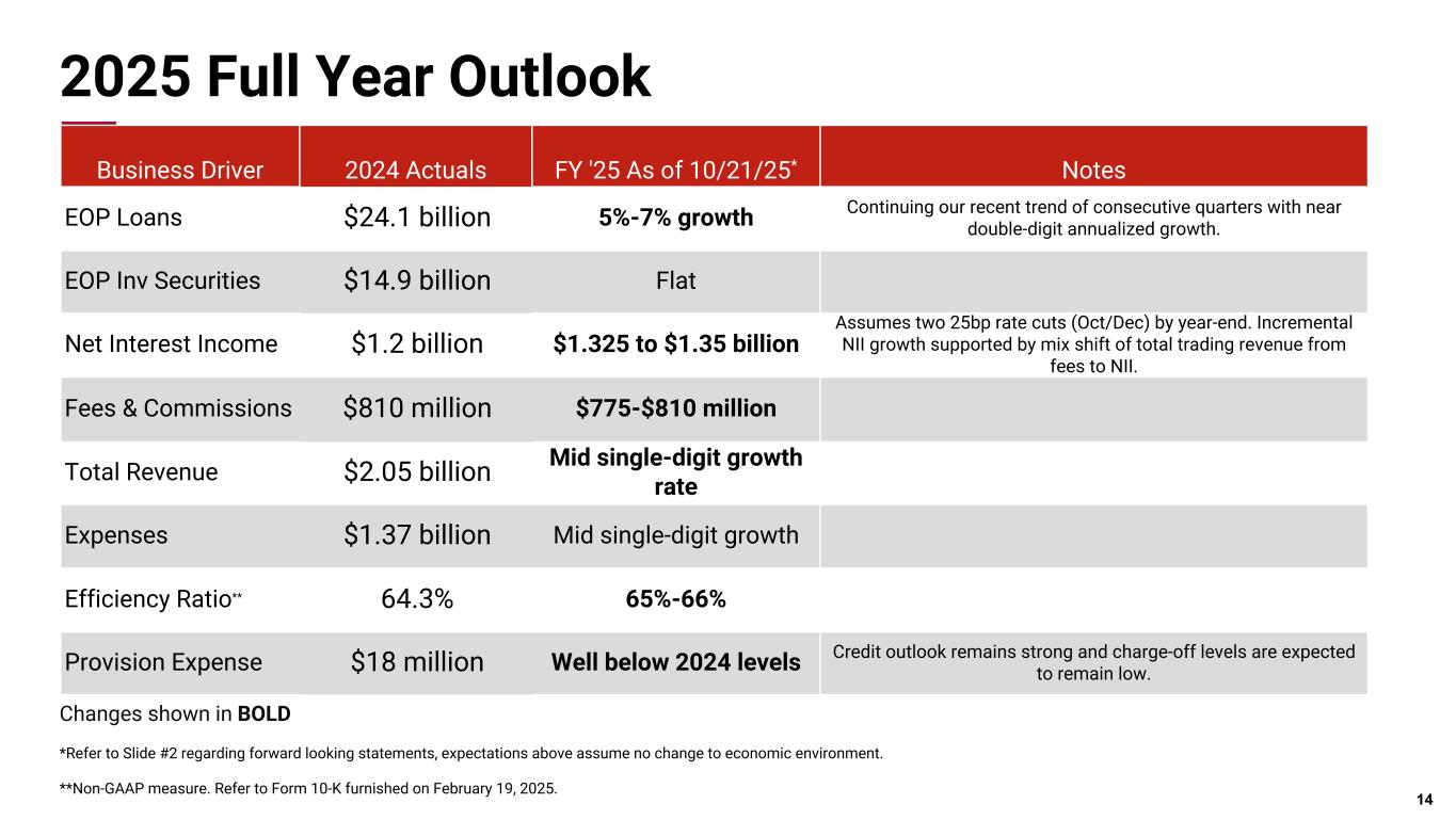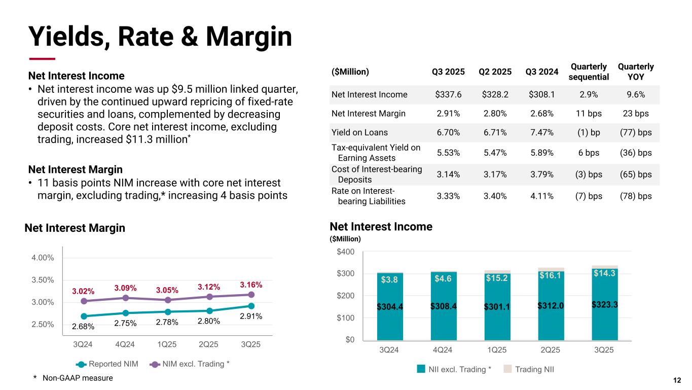 ステーシー・カイムズ社長兼最高経営責任者(CEO)は、次のように述べた。「融資の堅調な伸び、純利鞘の改善、ウェルス資産の増加により、今四半期の業績が好調であったことを誇りに思います。貸出金は当四半期にさらに5億7300万ドル増加し、第1四半期の関税不安による市場の変動後、過去2四半期で約12億ドル(年率10%)増加しました。また、同期間中に純金利マージンが 13bp 上昇し、有意義な拡大を達成しました。当部門のフィービジネスは引き続き勢いを増し、インベストメント・バンキング部門の収益は四半期ベースで最高を記録し、資産残高は過去6ヵ月間で87億ドル増の1,227億ドルに拡大した。第 4 四半期もこの成功に続く態勢を整えており、株主の皆様に長期的な価値を提供しつつ、好調な軌道を維 持することに引き続き注力していきます。2025年度第3四半期の正味受取利息は3億3,760万ドルとなり、前期から950万ドル増加しました。