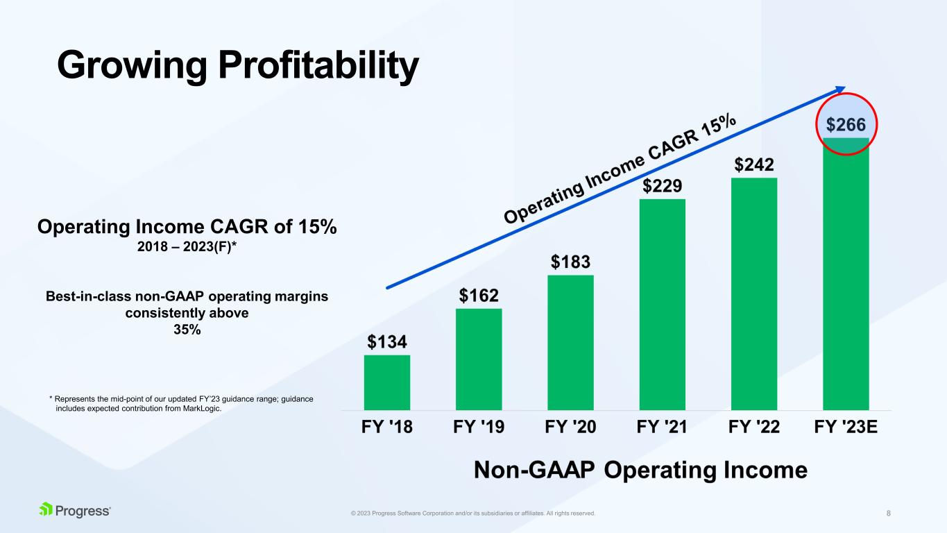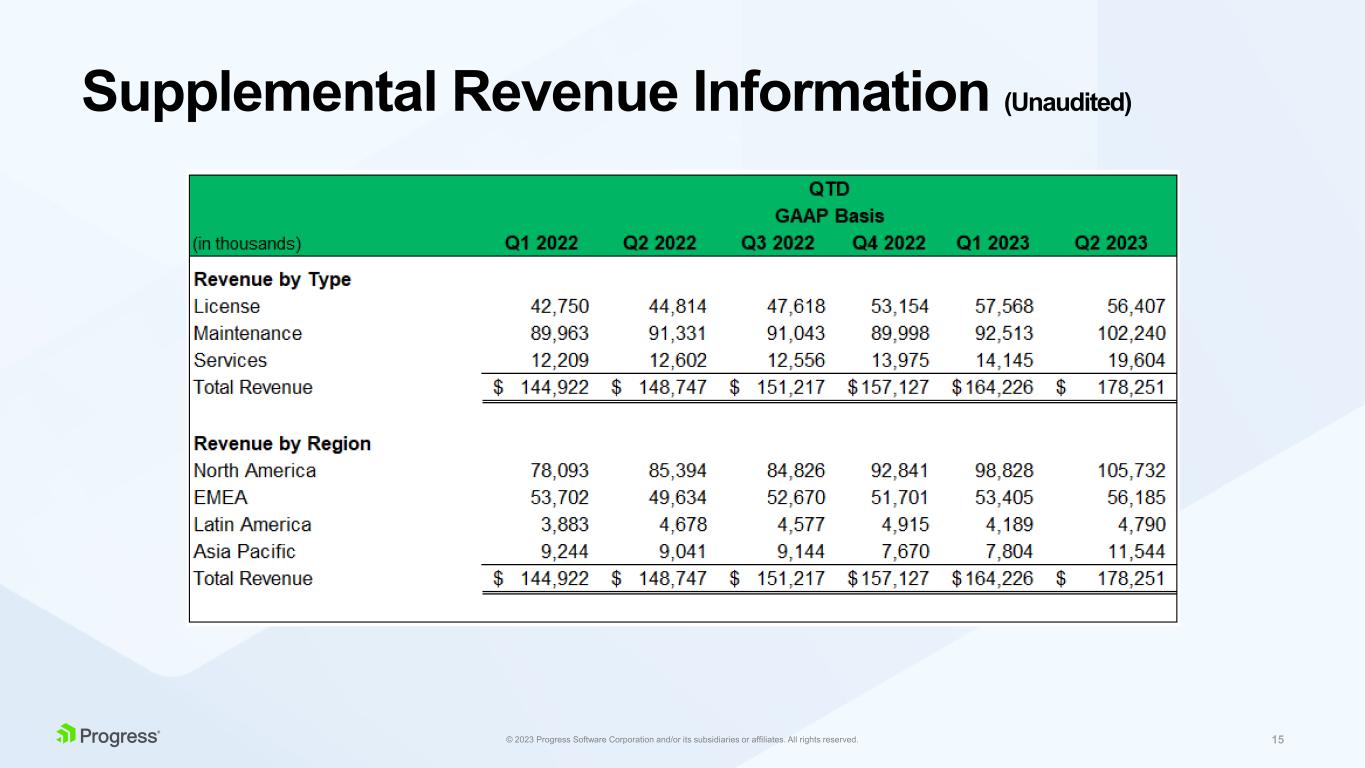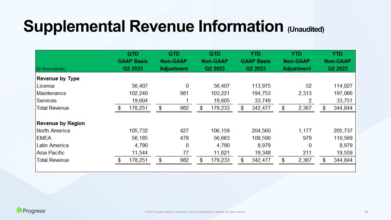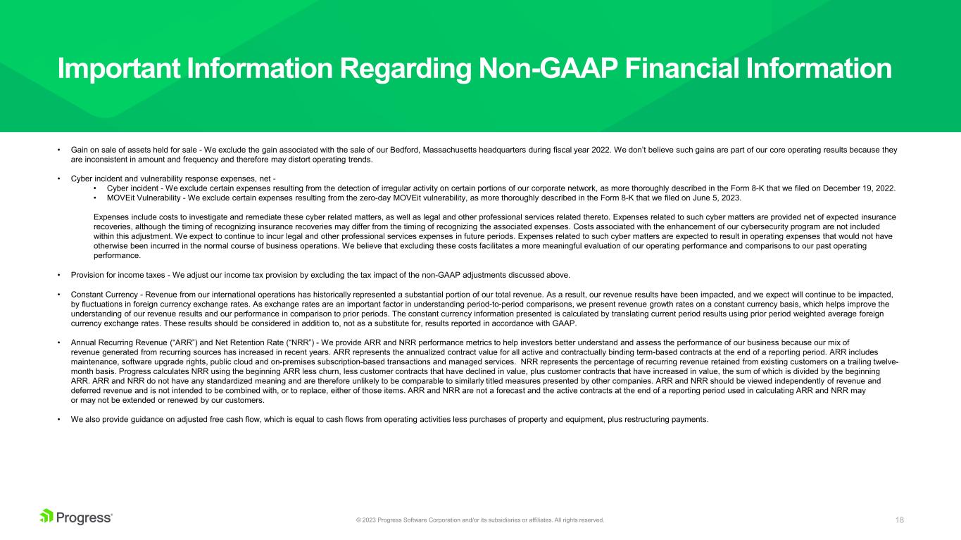 プログレスは、財務結果に対して特定の非GAAP補足情報を提供しています。なぜなら、当社の経営陣は、当社事業の通常の収益を反映していないと考える特定のGAAP関連項目の影響を除外することで、そのような情報は当社事業の根本的な傾向を説明するのに役立ち、継続事業のより比較可能な指標を提供し、当社事業の主要な事業からの結果についてより深く理解することができると考えているからです。また経営陣は、予算や経営目標の設定、業績の評価、経営資源の配分のために、このような非GAAPベースの財務指標を使用しています。加えて、当社の役員および非執行役員の報酬の一部は、このような非GAAPベースの財務指標で評価される当社の業績に基づいています。当社は、このような非GAAPベースの財務指標が、当社の現在の財務業績および将来の見通しに対する投資家の全般的な理解を高めると考えています:(i)特定の財務指標の透明性を高め、(ii)当社がどのように事業計画を立案し、業績を測定しているかを投資家が理解するのに役立つ情報開示を行い、(iii)同業他社と比較しやすい当社の業績観を提供し、(iv)投資家がGAAPベースと非GAAPベースの両方で当社の業績を検討できるようにする(当社の先行買収および提案中の買収の統合期間後を含む)。しかしながら、このnon-GAAP情報は、米国で一般に認められた会計原則(以下「GAAP」)に準拠したものではなく、またGAAPに代わるものでもなく、non-GAAP情報から除外される項目がプログレスの業績に重大な影響を与える可能性があるため、当社のGAAP業績と併せて考慮する必要があります。プログレスのGAAP財務結果に対する非GAAP調整の調整は、本プレスリリースの末尾の表に含まれています。