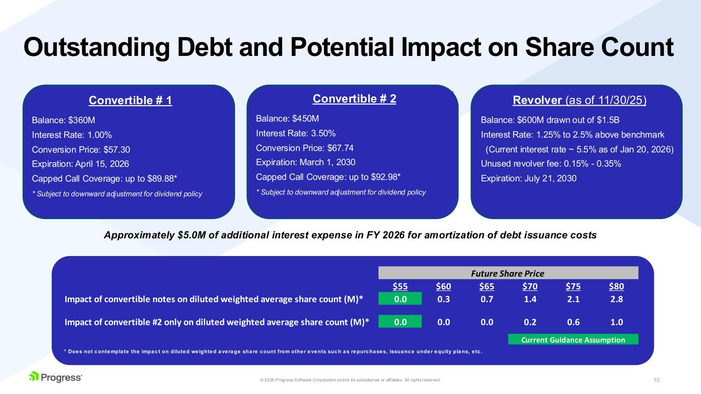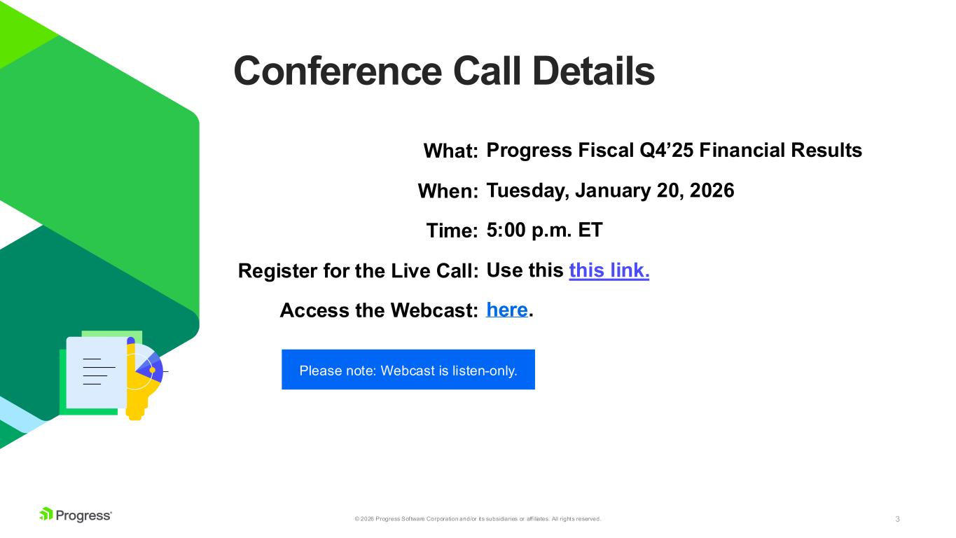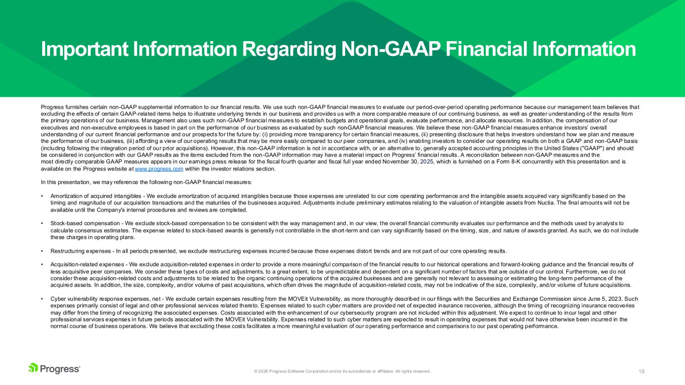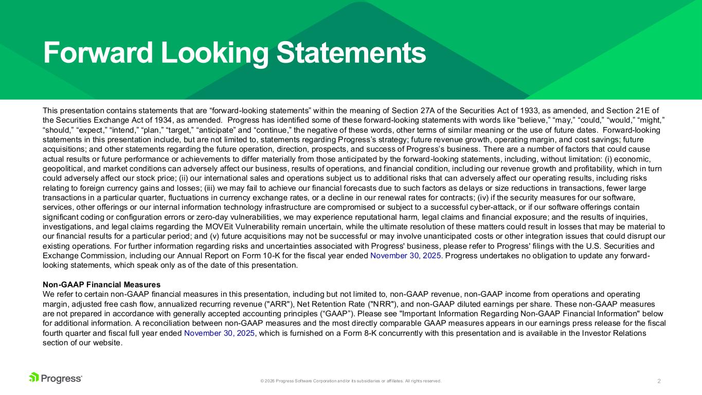 This press release contains statements that are "forward-looking statements" within the meaning of Section 27A of the Securities Act of 1933, as amended, and Section 21E of the Securities Exchange Act of 1934, as amended. Progress has identified some of these forward-looking statements with words like "believe," "may," "could," "would," "might," "should," "expect," "intend," "plan," "target," "anticipate" and "continue," the negative of these words, other terms of similar meaning or the use of future dates. Forward-looking statements in this press release include, but are not limited to, statements regarding Progress' business outlook (including future acquisition activity) and financial guidance. There are a number of factors that could cause actual results or future events to differ materially from those anticipated by the forward-looking statements, including, without limitation: (i) economic, geopolitical, and market conditions can adversely affect our business, results of operations, and financial condition, including our revenue growth and profitability, which in turn could adversely affect our stock price; (ii) our international sales and operations subject us to additional risks that can adversely affect our operating results, including risks relating to foreign currency gains and losses; (iii) we may fail to achieve our financial forecasts due to such factors as delays or size reductions in transactions, fewer large transactions in a particular quarter, fluctuations in currency exchange rates, or a decline in our renewal rates for contracts; (iv) if the security measures for our software, services, other offerings or our internal information technology infrastructure are compromised or subject to a successful cyber-attack, or if our software offerings contain significant coding or configuration errors or zero-day vulnerabilities, we may experience reputational harm, legal claims and financial exposure; and the results of inquiries, investigations and legal claims regarding the MOVEit Vulnerability remain uncertain, while the ultimate resolution of these matters could result in losses that may be material to our financial results for a particular period; and (v) future acquisitions may not be successful or may involve unanticipated costs or other integration issues that could disrupt our existing operations. For further information regarding risks and uncertainties associated with Progress' business, please refer to our filings with the Securities and Exchange Commission, including our Annual Report on Form 10-K for the fiscal year ended November 30, 2025. Progress undertakes no obligation to update any forward-looking statements, which speak only as of the date of this press release.