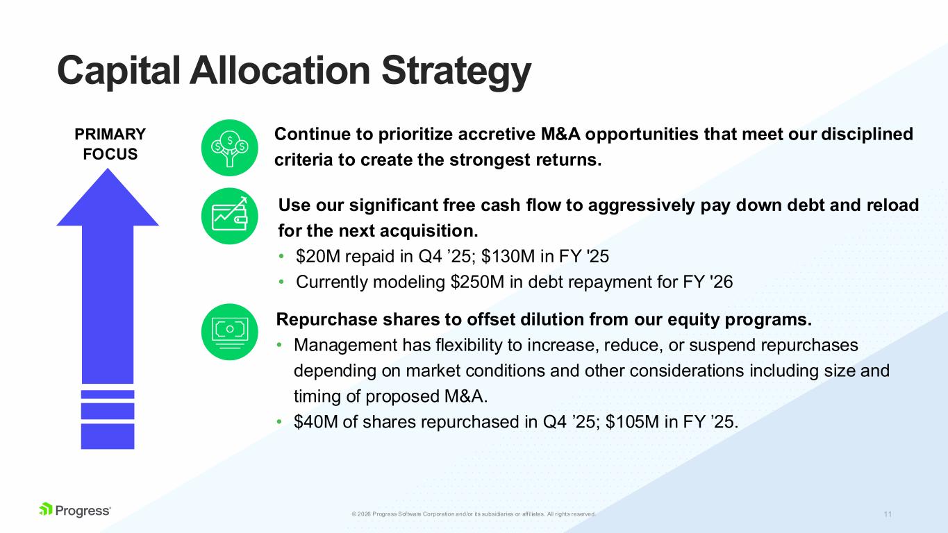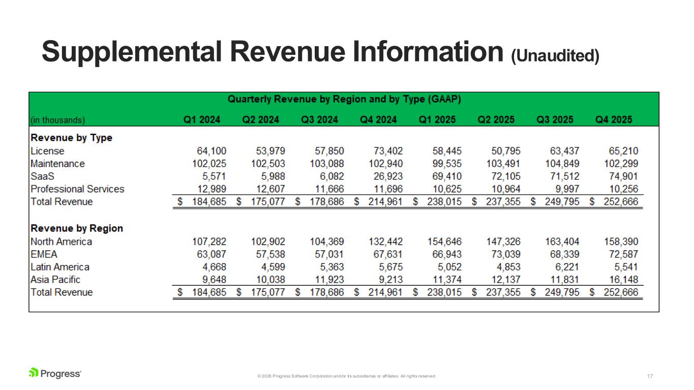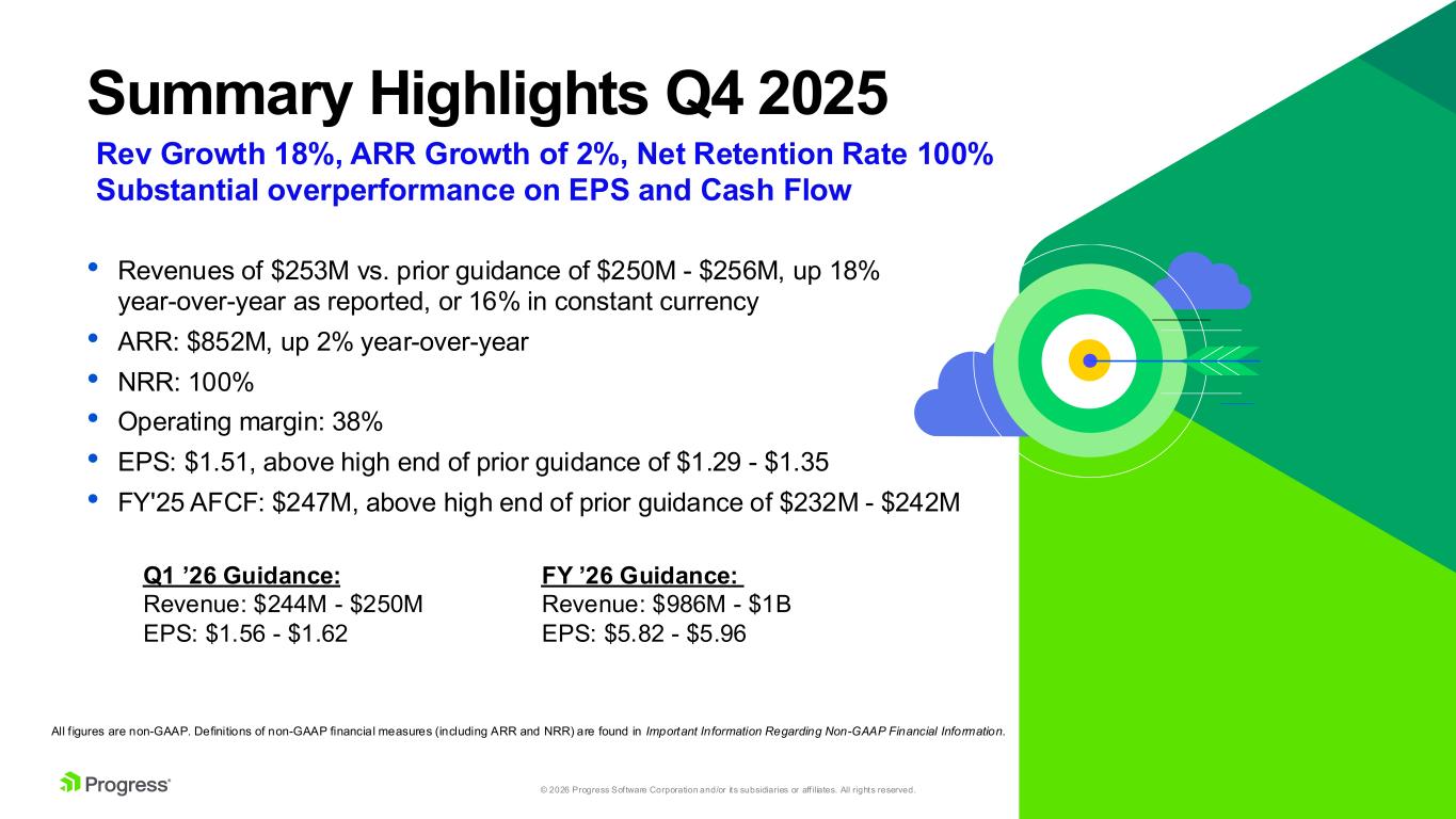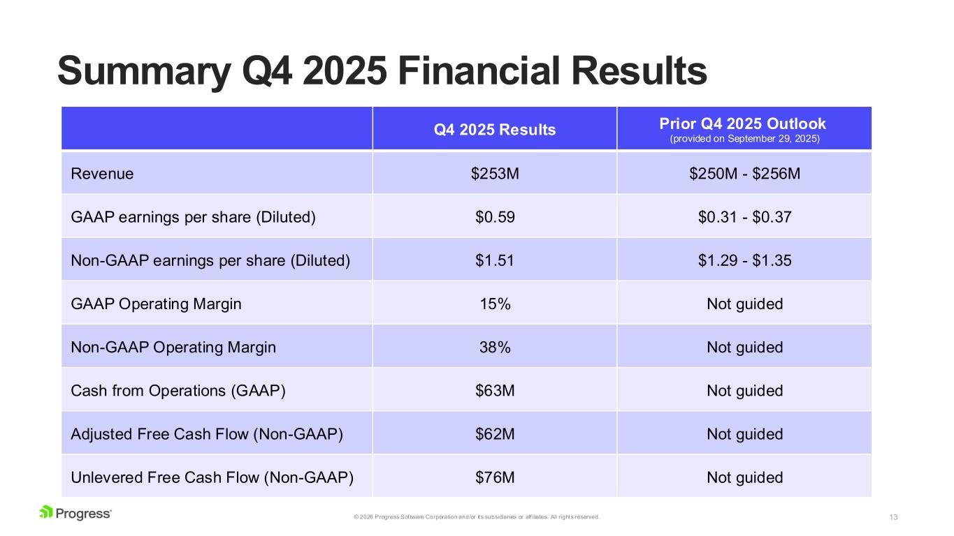 Anthony Folger, Progress CFO, said: "Q4'25 was the capstone of an outstanding year for Progress. We're starting FY26 with solid operating momentum, a stronger balance sheet, and a positive outlook for continued ARR growth." Progress provides the following guidance for the fiscal year ending November 30, 2026 and the fiscal first quarter ending February 28, 2026, together with actual results for the same periods in the fiscal year ending November 30, 2025: