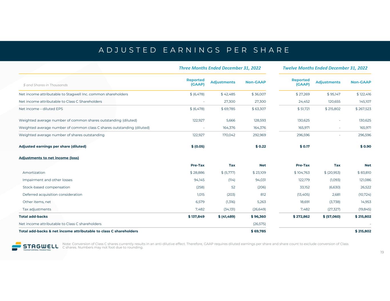 (4) 調整後希薄化後EPSは、(i)スタグウェル社の普通株主に帰属する純利益(損失)、ならびに償却費、減損損失およびその他の損失、株式報酬、繰延買収対価調整、個別税項目およびその他の項目を除くC種株主帰属純利益を(ii)(a)普通株式の発行済加重平均数あたりと(b)C種株式の発行済加重平均数(潜在株式を含む場合)で除したもの、と定義されています。その他の項目には、構造改革費用、買収関連費用、非経常的な項目が含まれ、希薄化防止ルールの適用対象となる。