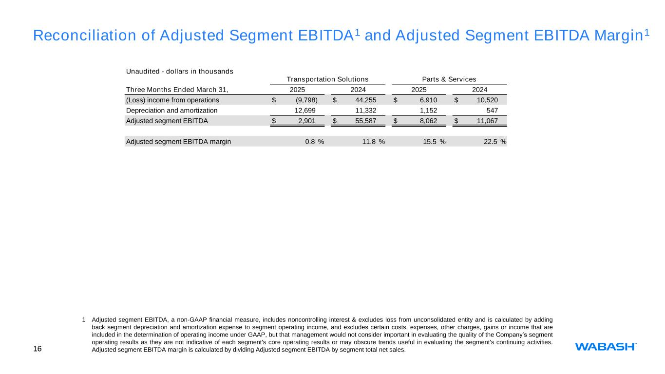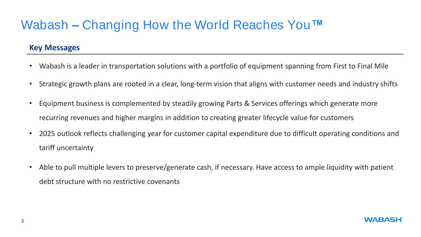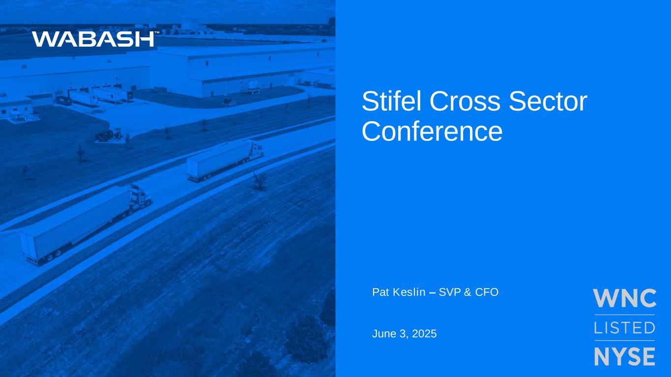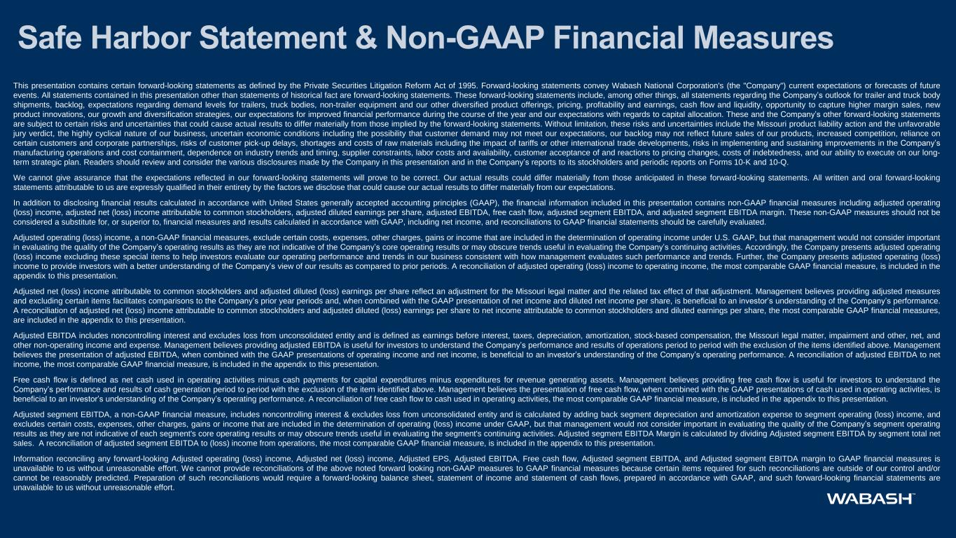 This presentation contains certain forward-looking statements as defined by the Private Securities Litigation Reform Act of 1995. Forward-looking statements convey Wabash National Corporation's (the "Company") current expectations or forecasts of future events. All statements contained in this presentation other than statements of historical fact are forward-looking statements. These forward-looking statements include, among other things, all statements regarding the Company’s outlook for trailer and truck body shipments, backlog, expectations regarding demand levels for trailers, truck bodies, non-trailer equipment and our other diversified product offerings, pricing, profitability and earnings, cash flow and liquidity, opportunity to capture higher margin sales, new product innovations, our growth and diversification strategies, our expectations for improved financial performance during the course of the year and our expectations with regards to capital allocation. These and the Company’s other forward-looking statements are subject to certain risks and uncertainties that could cause actual results to differ materially from those implied by the forward-looking statements. Without limitation, these risks and uncertainties include the Missouri product liability action and the unfavorable jury verdict, the highly cyclical nature of our business, uncertain economic conditions including the possibility that customer demand may not meet our expectations, our backlog may not reflect future sales of our products, increased competition, reliance on certain customers and corporate partnerships, risks of customer pick-up delays, shortages and costs of raw materials including the impact of tariffs or other international trade developments, risks in implementing and sustaining improvements in the Company’s manufacturing operations and cost containment, dependence on industry trends and timing, supplier constraints, labor costs and availability, customer acceptance of and reactions to pricing changes, costs of indebtedness, and our ability to execute on our long- term strategic plan. Readers should review and consider the various disclosures made by the Company in this presentation and in the Company’s reports to its stockholders and periodic reports on Forms 10-K and 10-Q. We cannot give assurance that the expectations reflected in our forward-looking statements will prove to be correct. Our actual results could differ materially from those anticipated in these forward-looking statements. All written and oral forward-looking statements attributable to us are expressly qualified in their entirety by the factors we disclose that could cause our actual results to differ materially from our expectations. In addition to disclosing financial results calculated in accordance with United States generally accepted accounting principles (GAAP), the financial information included in this presentation contains non-GAAP financial measures including adjusted operating (loss) income, adjusted net (loss) income attributable to common stockholders, adjusted diluted earnings per share, adjusted EBITDA, free cash flow, adjusted segment EBITDA, and adjusted segment EBITDA margin. These non-GAAP measures should not be considered a substitute for, or superior to, financial measures and results calculated in accordance with GAAP, including net income, and reconciliations to GAAP financial statements should be carefully evaluated. Adjusted operating (loss) income, a non-GAAP financial measures, exclude certain costs, expenses, other charges, gains or income that are included in the determination of operating income under U.S. GAAP, but that management would not consider important in evaluating the quality of the Company’s operating results as they are not indicative of the Company’s core operating results or may obscure trends useful in evaluating the Company’s continuing activities. Accordingly, the Company presents adjusted operating (loss) income excluding these special items to help investors evaluate our operating performance and trends in our business consistent with how management evaluates such performance and trends. Further, the Company presents adjusted operating (loss) income to provide investors with a better understanding of the Company’s view of our results as compared to prior periods. A reconciliation of adjusted operating (loss) income to operating income, the most comparable GAAP financial measure, is included in the appendix to this presentation. Adjusted net (loss) income attributable to common stockholders and adjusted diluted (loss) earnings per share reflect an adjustment for the Missouri legal matter and the related tax effect of that adjustment. Management believes providing adjusted measures and excluding certain items facilitates comparisons to the Company’s prior year periods and, when combined with the GAAP presentation of net income and diluted net income per share, is beneficial to an investor’s understanding of the Company’s performance. A reconciliation of adjusted net (loss) income attributable to common stockholders and adjusted diluted (loss) earnings per share to net income attributable to common stockholders and diluted earnings per share, the most comparable GAAP financial measures, are included in the appendix to this presentation. Adjusted EBITDA includes noncontrolling interest and excludes loss from unconsolidated entity and is defined as earnings before interest, taxes, depreciation, amortization, stock-based compensation, the Missouri legal matter, impairment and other, net, and other non-operating income and expense. Management believes providing adjusted EBITDA is useful for investors to understand the Company’s performance and results of operations period to period with the exclusion of the items identified above. Management believes the presentation of adjusted EBITDA, when combined with the GAAP presentations of operating income and net income, is 