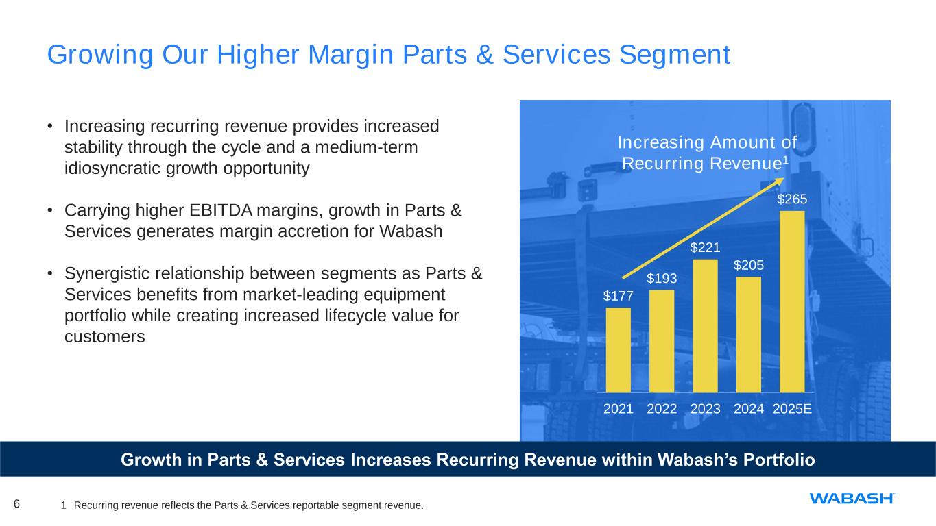 5WNC Investor Day | Purpose, Vision and Mission PURPOSE To change how the world reaches you VISION To be a premier provider of diverse solutions that optimize customers’ end-to-end supply chains across transportation, logistics and infrastructure markets. MISSION To transform Wabash into a dynamic growth organization by merging physical and digital technology to seamlessly serve our customers through a connected ecosystem of partners. One Wabash Approach Reflects Our Vision • Branding change was symbolic for significant strategic changes as One Wabash • Organizational structure changes part of redefining and reimagining our identity with all stakeholders Well-positioned at intersection of seismic shifts in core transportation, logistics and infrastructure markets • Transportation being reshaped by structural shifts, disruptive technologies, and changing trade dynamics • Developing and partnering to enhance the breadth of our capabilities • Provide one-stop shop for First to Final Mile equipment • Wrapping service offerings around equipment solutions to enhance lifecycle value creation 5
