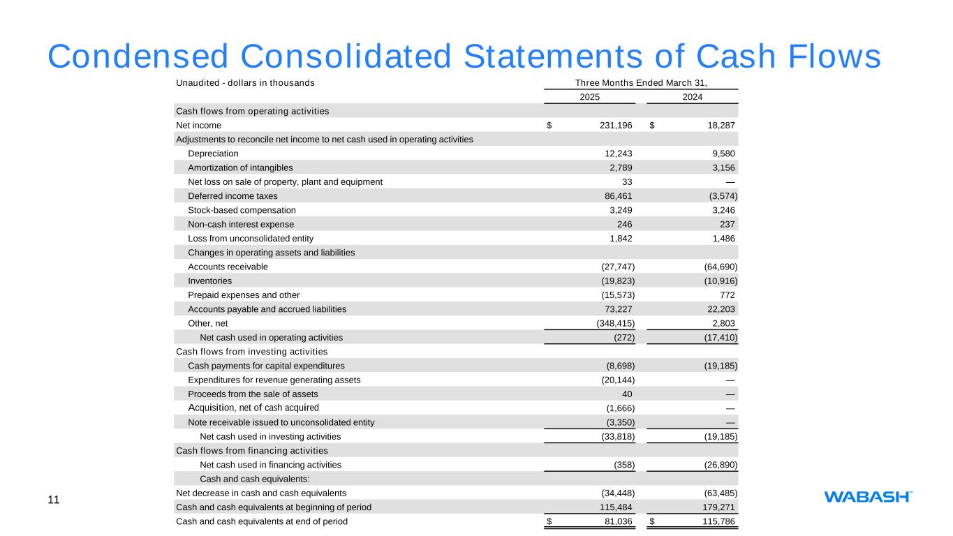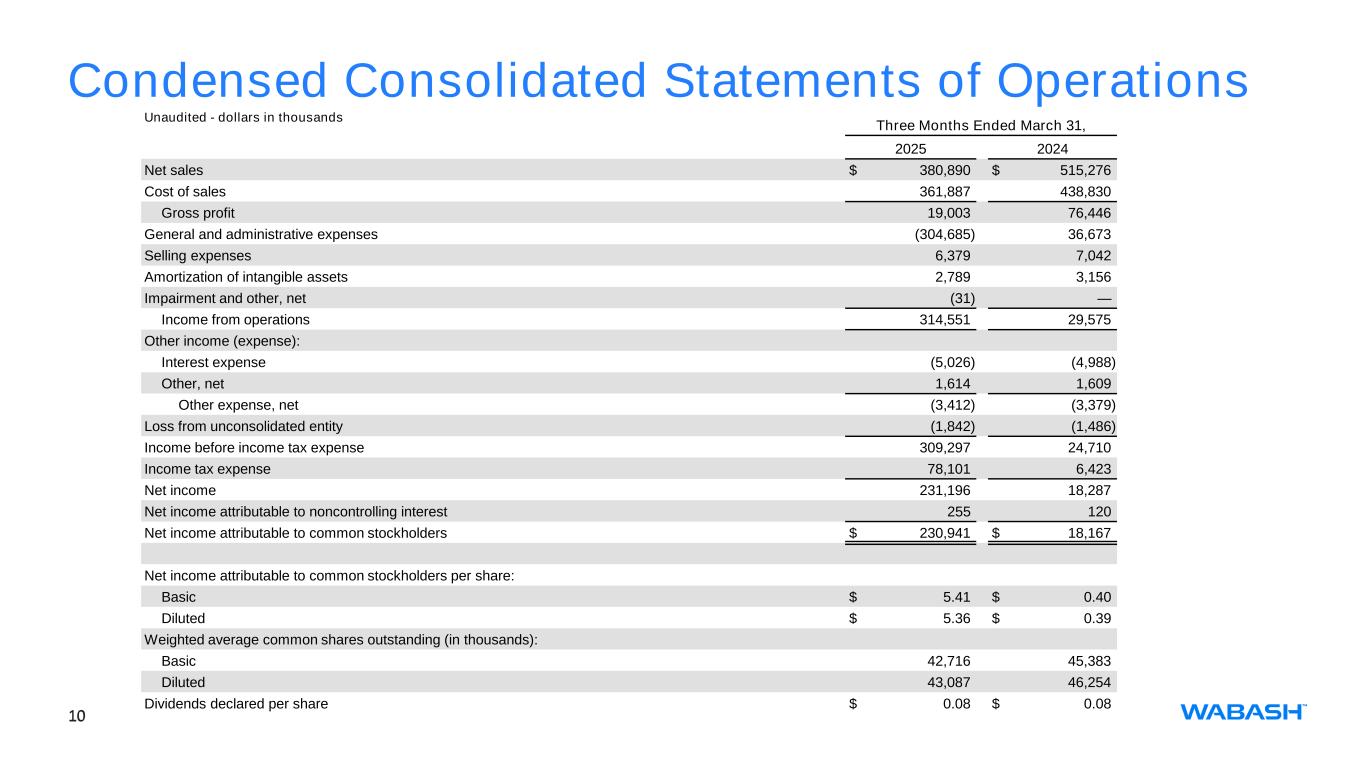 9 Condensed Consolidated Balance Sheets Unaudited - dollars in thousands March 31, 2025 December 31, 2024 Assets Current assets: Cash and cash equivalents $ 81,036 $ 115,484 Accounts receivable, net 171,693 143,946 Inventories, net 278,648 258,825 Prepaid expenses and other 126,191 76,233 Total current assets 657,568 594,488 Property, plant, and equipment, net 335,501 339,247 Goodwill 196,662 188,441 Deferred income taxes 8,411 94,873 Intangible assets, net 71,656 74,445 Investment in unconsolidated entities 7,250 7,250 Other assets 138,145 112,785 Total assets $ 1,415,193 $ 1,411,529 Liabilities and Stockholders’ Equity Current liabilities: Current portion of long-term debt $ — $ — Accounts payable 211,199 146,738 Other accrued liabilities 204,165 161,671 Total current liabilities 415,364 308,409 Long-term debt 417,317 397,142 Deferred income taxes — — Other non-current liabilities 177,420 516,152 Total liabilities 1,010,101 1,221,703 Commitments and contingencies Noncontrolling interest 1,251 996 Total Wabash National Corporation stockholders' equity 403,841 188,830 Total liabilities, noncontrolling interest, and equity $ 1,415,193 $ 1,411,529