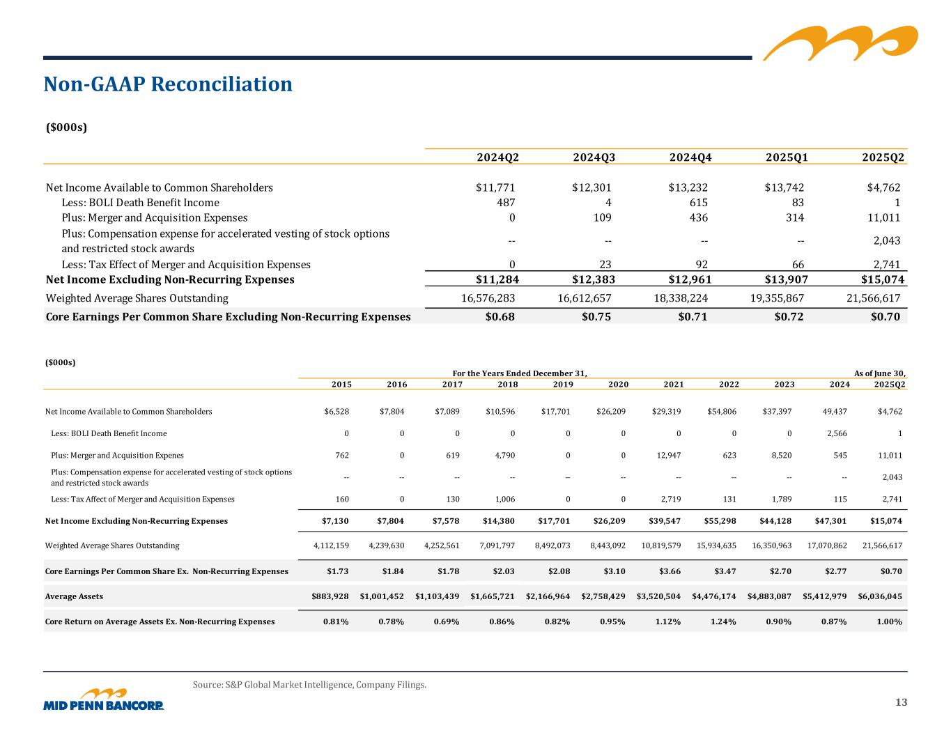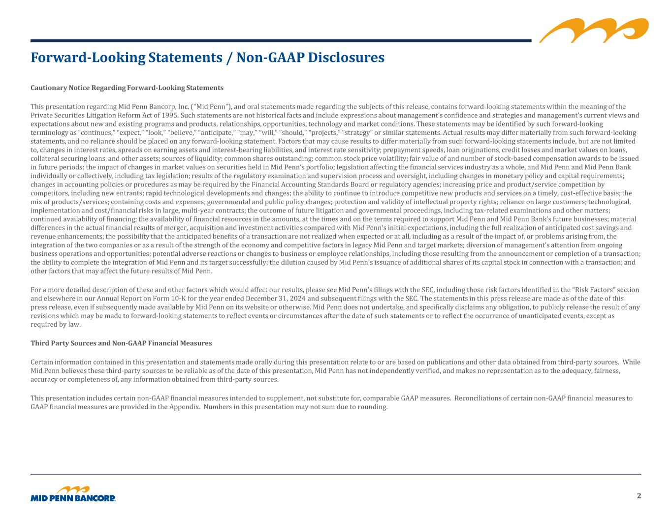 2 Cautionary Notice Regarding Forward-Looking Statements This presentation regarding Mid Penn Bancorp, Inc. (“Mid Penn”), and oral statements made regarding the subjects of this release, contains forward-looking statements within the meaning of the Private Securities Litigation Reform Act of 1995. Such statements are not historical facts and include expressions about management’s confidence and strategies and management’s current views and expectations about new and existing programs and products, relationships, opportunities, technology and market conditions. These statements may be identified by such forward-looking terminology as “continues,” “expect,” “look,” “believe,” “anticipate,” “may,” “will,” “should,” “projects,” “strategy” or similar statements. Actual results may differ materially from such forward-looking statements, and no reliance should be placed on any forward-looking statement. Factors that may cause results to differ materially from such forward-looking statements include, but are not limited to, changes in interest rates, spreads on earning assets and interest-bearing liabilities, and interest rate sensitivity; prepayment speeds, loan originations, credit losses and market values on loans, collateral securing loans, and other assets; sources of liquidity; common shares outstanding; common stock price volatility; fair value of and number of stock-based compensation awards to be issued in future periods; the impact of changes in market values on securities held in Mid Penn’s portfolio; legislation affecting the financial services industry as a whole, and Mid Penn and Mid Penn Bank individually or collectively, including tax legislation; results of the regulatory examination and supervision process and oversight, including changes in monetary policy and capital requirements; changes in accounting policies or procedures as may be required by the Financial Accounting Standards Board or regulatory agencies; increasing price and product/service competition by competitors, including new entrants; rapid technological developments and changes; the ability to continue to introduce competitive new products and services on a timely, cost-effective basis; the mix of products/services; containing costs and expenses; governmental and public policy changes; protection and validity of intellectual property rights; reliance on large customers; technological, implementation and cost/financial risks in large, multi-year contracts; the outcome of future litigation and governmental proceedings, including tax-related examinations and other matters; continued availability of financing; the availability of financial resources in the amounts, at the times and on the terms required to support Mid Penn and Mid Penn Bank’s future businesses; material differences in the actual financial results of merger, acquisition and investment activities compared with Mid Penn’s initial expectations, including the full realization of anticipated cost savings and revenue enhancements; the possibility that the anticipated benefits of a transaction are not realized when expected or at all, including as a result of the impact of, or problems arising from, the integration of the two companies or as a result of the strength of the economy and competitive factors in legacy Mid Penn and target markets; diversion of management’s attention from ongoing business operations and opportunities; potential adverse reactions or changes to business or employee relationships, including those resulting from the announcement or completion of a transaction; the ability to complete the integration of Mid Penn and its target successfully; the dilution caused by Mid Penn’s issuance of additional shares of its capital stock in connection with a transaction; and other factors that may affect the future results of Mid Penn. For a more detailed description of these and other factors which would affect our results, please see Mid Penn’s filings with the SEC, including those risk factors identified in the “Risk Factors” section and elsewhere in our Annual Report on Form 10-K for the year ended December 31, 2024 and subsequent filings with the SEC. The statements in this press release are made as of the date of this press release, even if subsequently made available by Mid Penn on its website or otherwise. Mid Penn does not undertake, and specifically disclaims any obligation, to publicly release the result of any revisions which may be made to forward-looking statements to reflect events or circumstances after the date of such statements or to reflect the occurrence of unanticipated events, except as required by law. Third Party Sources and Non-GAAP Financial Measures Certain information contained in this presentation and statements made orally during this presentation relate to or are based on publications and other data obtained from third-party sources. While Mid Penn believes these third-party sources to be reliable as of the date of this presentation, Mid Penn has not independently verified, and makes no representation as to the adequacy, fairness, accuracy or completeness of, any information obtained from third-party sources. This presentation includes certain non-GAAP financial measures intended to supplement, not substitute for, comparable GAAP measures. Reconciliations of certain non-GAAP financial measures to GAAP financial measures are provided in the Appendix. Numbers in this presentation may not sum due to rounding. Forward-Looking Statements / Non-GAAP Disclosures