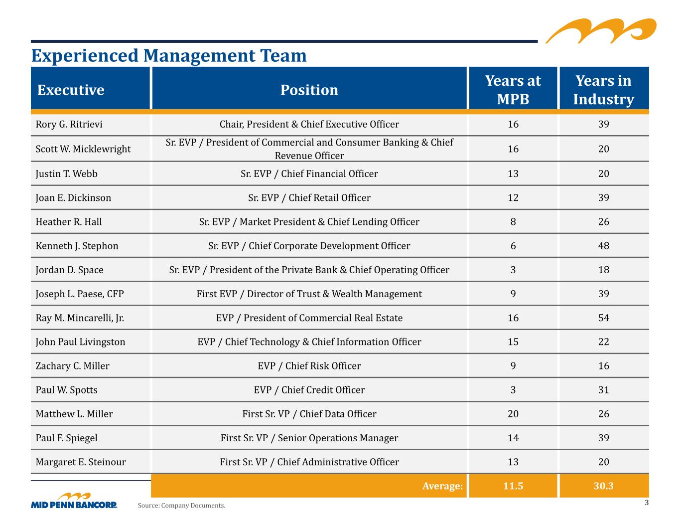 3 Experienced Management Team Source: Company Documents. Years in Industry Years at MPB PositionExecutive 3916Chair, President & Chief Executive OfficerRory G. Ritrievi 2016 Sr. EVP / President of Commercial and Consumer Banking & Chief Revenue Officer Scott W. Micklewright 2013Sr. EVP / Chief Financial Officer Justin T. Webb 3912Sr. EVP / Chief Retail OfficerJoan E. Dickinson 268Sr. EVP / Market President & Chief Lending OfficerHeather R. Hall 486Sr. EVP / Chief Corporate Development OfficerKenneth J. Stephon 183Sr. EVP / President of the Private Bank & Chief Operating OfficerJordan D. Space 399First EVP / Director of Trust & Wealth ManagementJoseph L. Paese, CFP 5416EVP / President of Commercial Real EstateRay M. Mincarelli, Jr. 2215EVP / Chief Technology & Chief Information OfficerJohn Paul Livingston 169EVP / Chief Risk OfficerZachary C. Miller 313EVP / Chief Credit OfficerPaul W. Spotts 2620First Sr. VP / Chief Data OfficerMatthew L. Miller 3914First Sr. VP / Senior Operations ManagerPaul F. Spiegel 2013First Sr. VP / Chief Administrative OfficerMargaret E. Steinour 30.311.5Average: