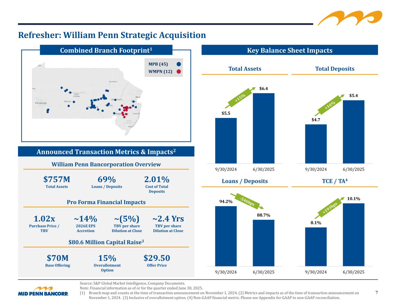 6 Mid Penn Bancorp, Inc. Overview at June 30, 2025 Source: S&P Global Market Intelligence, Company Documents. Note: Financial information as of or for the quarter ended June 30, 2025. (1) Annualized financial metric. (2) Non-GAAP financial metric. Please see Appendix for GAAP to non-GAAP reconciliation. (3) Excludes HFS loans. (4) Inclusive of overallotment option. (5) 12 Branches added as of 4/30/2025 for a total of 59 MPB branches, as a result of the acquisition of William Penn Bancorporation. Assets Gross Loans Deposits $6.4 B $4.8 B $5.4 B Holding Company for Mid Penn Bank 2Q25 Financial Highlights 0.44%NPAs / Assets $4.8m / $0.22 /sh Net Income 0.07% MRQ NCOs / Avg. Loans1 10.1%TCE / TA2 88.7%Loans / Deposits33.44%MRQ NIM1 • Banking subsidiary: Mid Penn Bank (est. 1868), state chartered non-member bank and trust company, headquartered in Millersburg, PA • A PA-based commercial bank operating strategically throughout Pennsylvania and central and southern New Jersey • Dedicated to providing comprehensive banking and trust services • Highly active over the prior year. Key strategic initiatives include: Closed acquisition of south-central Pennsylvania based insurance agency, Charis Insurance Group, Inc., in May 2025 for a purchase price of $4.0 million Closed acquisition of William Penn Bancorporation in April 2025 for a purchase price of $120.0 million $80.6 million4 common equity raise completed in November 2024 ‒ 2,731,250 common shares issued | $29.50 per share Highlights MPB (59)5 Branch Footprint GAAP ROAA1 0.32% Core ROAA1,2 1.00% ROATCE1,2 4.05% Core ROATCE1,2 11.86%