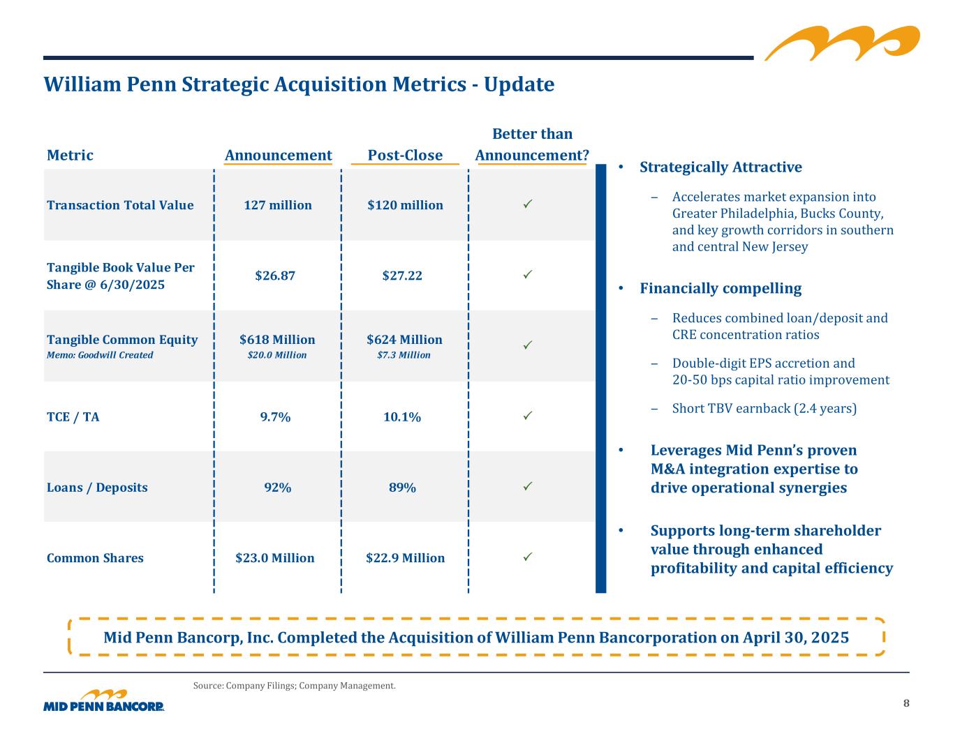7 $4.7 $5.4 9/30/2024 6/30/2025 $5.5 $6.4 9/30/2024 6/30/2025 Source: S&P Global Market Intelligence, Company Documents. Note: Financial information as of or for the quarter ended June 30, 2025. (1) Branch map and counts at the time of transaction announcement on November 1, 2024. (2) Metrics and impacts as of the time of transaction announcement on November 1, 2024. (3) Inclusive of overallotment option. (4) Non-GAAP financial metric. Please see Appendix for GAAP to non-GAAP reconciliation. 94.2% 88.7% 9/30/2024 6/30/2025 Refresher: William Penn Strategic Acquisition MPB (45) WMPN (12) Announced Transaction Metrics & Impacts2 Combined Branch Footprint1 Key Balance Sheet Impacts Loans / Deposits Total Assets Total Deposits TCE / TA469% Loans / Deposits 2.01% Cost of Total Deposits William Penn Bancorporation Overview ~14% 2026E EPS Accretion ~(5%) TBV per share Dilution at Close ~2.4 Yrs TBV per share Dilution at Close Pro Forma Financial Impacts $70M Base Offering 15% Overallotment Option $29.50 Offer Price $80.6 Million Capital Raise3 8.1% 10.1% 9/30/2024 6/30/2025 1.02x Purchase Price / TBV $757M Total Assets