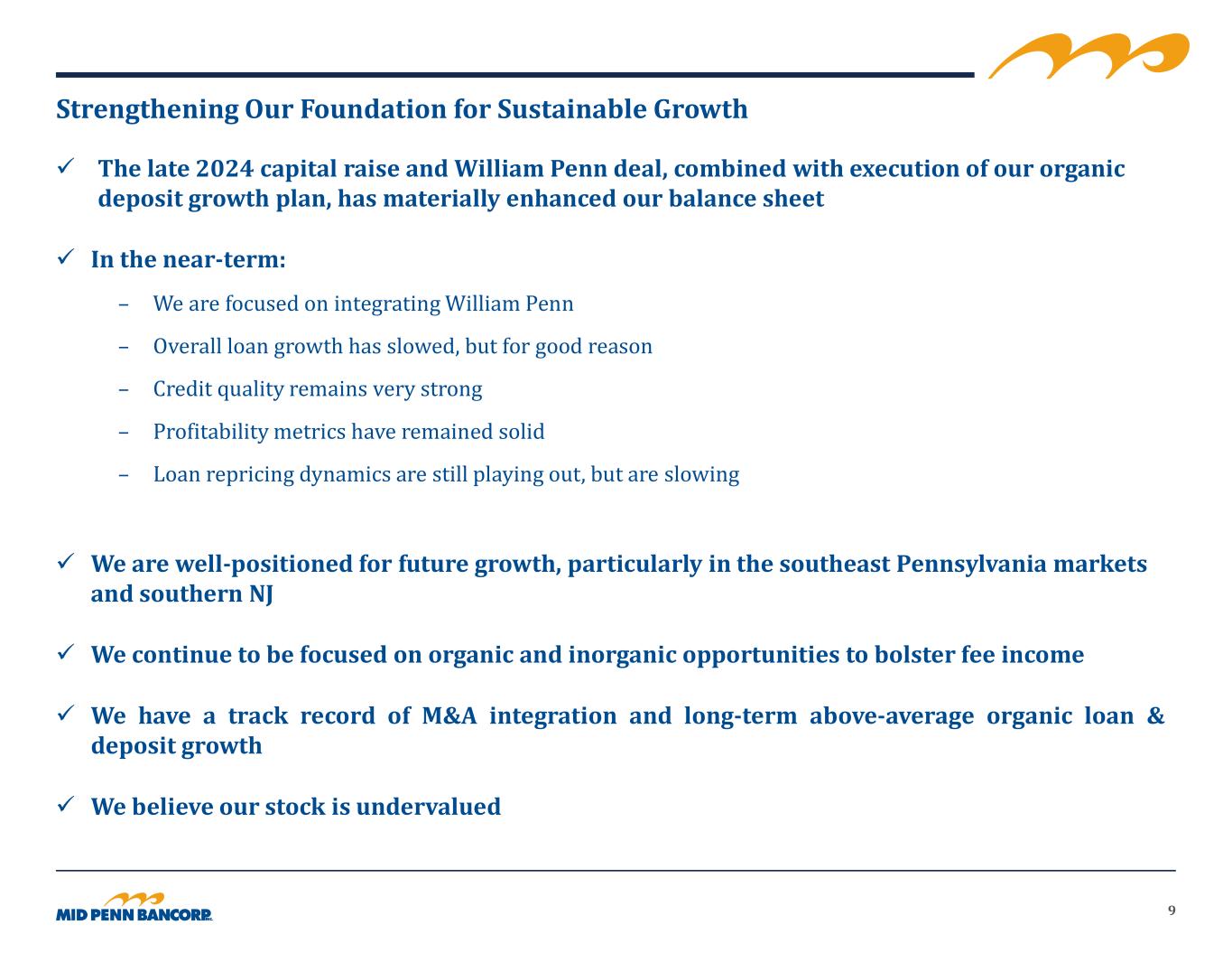 8 William Penn Strategic Acquisition Metrics - Update Source: Company Filings; Company Management. • Strategically Attractive ‒ Accelerates market expansion into Greater Philadelphia, Bucks County, and key growth corridors in southern and central New Jersey • Financially compelling ‒ Reduces combined loan/deposit and CRE concentration ratios ‒ Double-digit EPS accretion and 20-50 bps capital ratio improvement ‒ Short TBV earnback (2.4 years) • Leverages Mid Penn’s proven M&A integration expertise to drive operational synergies • Supports long-term shareholder value through enhanced profitability and capital efficiency Better than Metric Announcement Post-Close Announcement? Transaction Total Value 127 million $120 million P Tangible Book Value Per Share @ 6/30/2025 $26.87 $27.22 P Tangible Common Equity Memo: Goodwill Created $618 Million $20.0 Million $624 Million $7.3 Million P TCE / TA 9.7% 10.1% P Loans / Deposits 92% 89% P Common Shares $23.0 Million $22.9 Million P Mid Penn Bancorp, Inc. Completed the Acquisition of William Penn Bancorporation on April 30, 2025