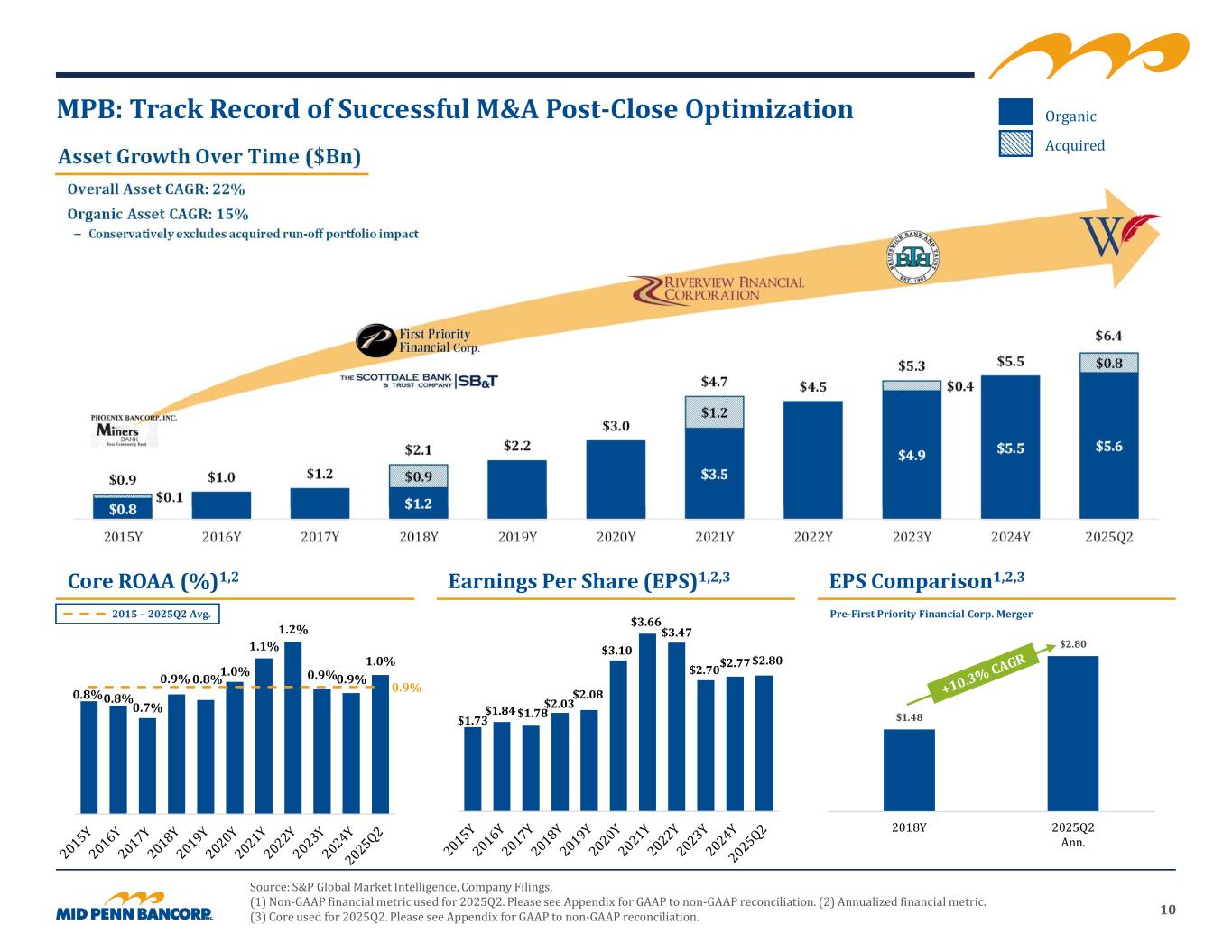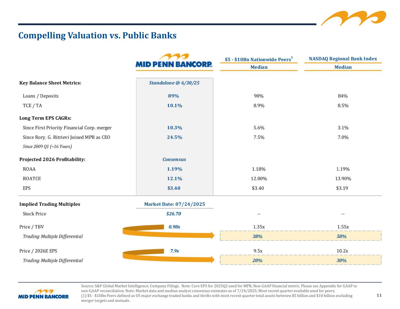 10 $1.48 $2.80 2018Y 2025Q2 Ann. 0.8% 0.8% 0.7% 0.9% 0.8% 1.0% 1.1% 1.2% 0.9% 0.9% 1.0% MPB: Track Record of Successful M&A Post-Close Optimization Source: S&P Global Market Intelligence, Company Filings. (1) Non-GAAP financial metric used for 2025Q2. Please see Appendix for GAAP to non-GAAP reconciliation. (2) Annualized financial metric. (3) Core used for 2025Q2. Please see Appendix for GAAP to non-GAAP reconciliation. Asset Growth Over Time ($Bn) Overall Asset CAGR: 22% Organic Asset CAGR: 15% – Conservatively excludes acquired run-off portfolio impact Organic Acquired Core ROAA (%)1,2 2015 – 2025Q2 Avg. Earnings Per Share (EPS)1,2,3 EPS Comparison1,2,3 $1.73 $1.84 $1.78 $2.03 $2.08 $3.10 $3.66 $3.47 $2.70 $2.77 $2.80 0.9% Pre-First Priority Financial Corp. Merger