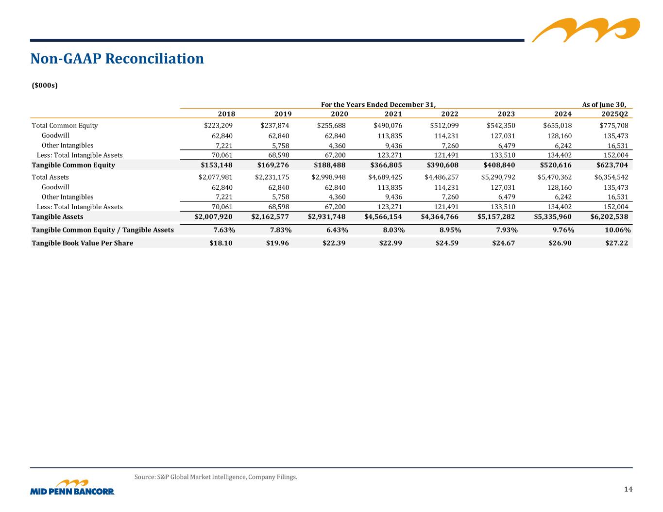 13 Non-GAAP Reconciliation ($000s) 2024Q2 2024Q3 2024Q4 2025Q1 2025Q2 Net Income Available to Common Shareholders $11,771 $12,301 $13,232 $13,742 $4,762 Less: BOLI Death Benefit Income 487 4 615 83 1 Plus: Merger and Acquisition Expenses 0 109 436 314 11,011 Plus: Compensation expense for accelerated vesting of stock options and restricted stock awards -- -- -- -- 2,043 Less: Tax Effect of Merger and Acquisition Expenses 0 23 92 66 2,741 Net Income Excluding Non-Recurring Expenses $11,284 $12,383 $12,961 $13,907 $15,074 Weighted Average Shares Outstanding 16,576,283 16,612,657 18,338,224 19,355,867 21,566,617 Core Earnings Per Common Share Excluding Non-Recurring Expenses $0.68 $0.75 $0.71 $0.72 $0.70 Source: S&P Global Market Intelligence, Company Filings. ($000s) For the Years Ended December 31, As of June 30, 2015 2016 2017 2018 2019 2020 2021 2022 2023 2024 2025Q2 Net Income Available to Common Shareholders $6,528 $7,804 $7,089 $10,596 $17,701 $26,209 $29,319 $54,806 $37,397 49,437 $4,762 Less: BOLI Death Benefit Income 0 0 0 0 0 0 0 0 0 2,566 1 Plus: Merger and Acquisition Expenes 762 0 619 4,790 0 0 12,947 623 8,520 545 11,011 Plus: Compensation expense for accelerated vesting of stock options and restricted stock awards -- -- -- -- -- -- -- -- -- -- 2,043 Less: Tax Affect of Merger and Acquisition Expenses 160 0 130 1,006 0 0 2,719 131 1,789 115 2,741 Net Income Excluding Non-Recurring Expenses $7,130 $7,804 $7,578 $14,380 $17,701 $26,209 $39,547 $55,298 $44,128 $47,301 $15,074 Weighted Average Shares Outstanding 4,112,159 4,239,630 4,252,561 7,091,797 8,492,073 8,443,092 10,819,579 15,934,635 16,350,963 17,070,862 21,566,617 Core Earnings Per Common Share Ex. Non-Recurring Expenses $1.73 $1.84 $1.78 $2.03 $2.08 $3.10 $3.66 $3.47 $2.70 $2.77 $0.70 Average Assets $883,928 $1,001,452 $1,103,439 $1,665,721 $2,166,964 $2,758,429 $3,520,504 $4,476,174 $4,883,087 $5,412,979 $6,036,045 Core Return on Average Assets Ex. Non-Recurring Expenses 0.81% 0.78% 0.69% 0.86% 0.82% 0.95% 1.12% 1.24% 0.90% 0.87% 1.00%