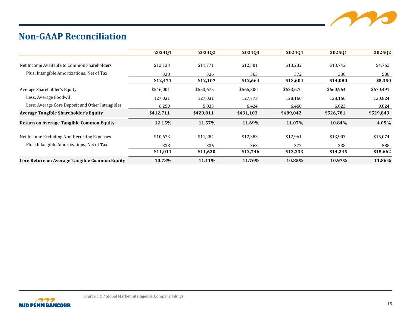 14 Non-GAAP Reconciliation Source: S&P Global Market Intelligence, Company Filings. ($000s) For the Years Ended December 31, As of June 30, 2018 2019 2020 2021 2022 2023 2024 2025Q2 Total Common Equity $223,209 $237,874 $255,688 $490,076 $512,099 $542,350 $655,018 $775,708 Goodwill 62,840 62,840 62,840 113,835 114,231 127,031 128,160 135,473 Other Intangibles 7,221 5,758 4,360 9,436 7,260 6,479 6,242 16,531 Less: Total Intangible Assets 70,061 68,598 67,200 123,271 121,491 133,510 134,402 152,004 Tangible Common Equity $153,148 $169,276 $188,488 $366,805 $390,608 $408,840 $520,616 $623,704 Total Assets $2,077,981 $2,231,175 $2,998,948 $4,689,425 $4,486,257 $5,290,792 $5,470,362 $6,354,542 Goodwill 62,840 62,840 62,840 113,835 114,231 127,031 128,160 135,473 Other Intangibles 7,221 5,758 4,360 9,436 7,260 6,479 6,242 16,531 Less: Total Intangible Assets 70,061 68,598 67,200 123,271 121,491 133,510 134,402 152,004 Tangible Assets $2,007,920 $2,162,577 $2,931,748 $4,566,154 $4,364,766 $5,157,282 $5,335,960 $6,202,538 Tangible Common Equity / Tangible Assets 7.63% 7.83% 6.43% 8.03% 8.95% 7.93% 9.76% 10.06% Tangible Book Value Per Share $18.10 $19.96 $22.39 $22.99 $24.59 $24.67 $26.90 $27.22