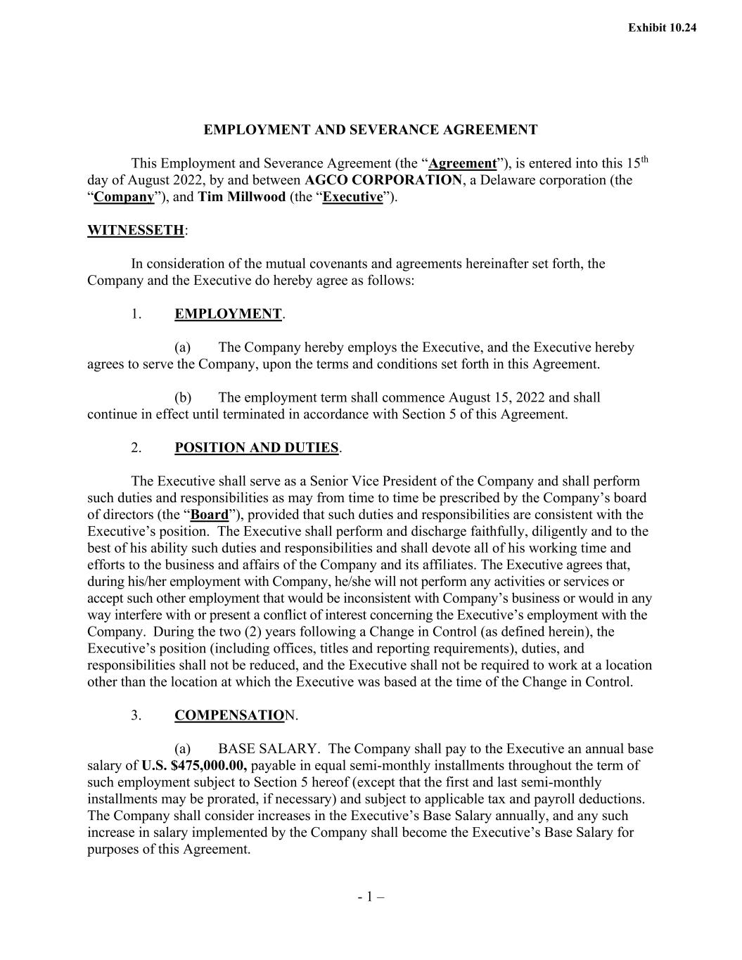 AGCO CORP /DE00008802662024FYfalsehttp://fasb.org/us-gaap/2024#AccountingStandardsUpdate201613MemberP5YP3YP5YP1MP4YP3Yhttp://fasb.org/us-gaap/2024#OtherAssetImpairmentChargesP1YP3Yhttp://fasb.org/us-gaap/2024#AccountsPayableCurrenthttp://fasb.org/us-gaap/2024#AccountsPayableCurrenthttp://fasb.org/us-gaap/2024#RestructuringCostshttp://fasb.org/us-gaap/2024#RestructuringCostshttp://fasb.org/us-gaap/2024#RestructuringCostshttp://fasb.org/us-gaap/2024#OtherAssetsCurrenthttp://fasb.org/us-gaap/2024#AccruedLiabilitiesCurrenthttp://fasb.org/us-gaap/2024#OtherAssetsCurrenthttp://fasb.org/us-gaap/2024#AccruedLiabilitiesCurrenthttp://fasb.org/us-gaap/2024#OtherLiabilitiesNoncurrenthttp://fasb.org/us-gaap/2024#OtherAssetsNoncurrenthttp://fasb.org/us-gaap/2024#OtherAssetsCurrenthttp://fasb.org/us-gaap/2024#AccruedLiabilitiesCurrenthttp://fasb.org/us-gaap/2024#AccruedLiabilitiesCurrenthttp://fasb.org/us-gaap/2024#OtherAssetsCurrenthttp://fasb.org/us-gaap/2024#OtherLiabilitiesNoncurrenthttp://fasb.org/us-gaap/2024#OtherAssetsNoncurrenthttp://fasb.org/us-gaap/2024#AccruedLiabilitiesCurrenthttp://fasb.org/us-gaap/2024#OtherAssetsCurrent33.3333.3333.331.51.5http://fasb.org/us-gaap/2024#PropertyPlantAndEquipmentAndFinanceLeaseRightOfUseAssetAfterAccumulatedDepreciationAndAmortizationhttp://fasb.org/us-gaap/2024#PropertyPlantAndEquipmentAndFinanceLeaseRightOfUseAssetAfterAccumulatedDepreciationAndAmortizationhttp://fasb.org/us-gaap/2024#AccruedLiabilitiesCurrenthttp://fasb.org/us-gaap/2024#AccruedLiabilitiesCurrenthttp://fasb.org/us-gaap/2024#OtherLiabilitiesCurrenthttp://fasb.org/us-gaap/2024#OtherLiabilitiesCurrenthttp://fasb.org/us-gaap/2024#OtherLiabilitiesNoncurrenthttp://fasb.org/us-gaap/2024#OtherLiabilitiesNoncurrent1111iso4217:USDxbrli:sharesiso4217:USDxbrli:sharesagco:dealer_and_distributoriso4217:TRYiso4217:ARSxbrli:pureagco:assetagco:reporting_unitiso4217:EURagco:loan_agreementiso4217:CHFagco:agreementiso4217:BRLagco:planagco:segment00008802662024-01-012024-12-3100008802662024-06-3000008802662025-02-1000008802662023-01-012023-12-3100008802662022-01-012022-12-3100008802662024-12-3100008802662023-12-310000880266us-gaap:CommonStockMember2021-12-310000880266us-gaap:AdditionalPaidInCapitalMember2021-12-310000880266us-gaap:RetainedEarningsMember2021-12-310000880266us-gaap:AccumulatedOtherComprehensiveIncomeMember2021-12-310000880266us-gaap:NoncontrollingInterestMember2021-12-3100008802662021-12-310000880266us-gaap:RetainedEarningsMember2022-01-012022-12-310000880266us-gaap:NoncontrollingInterestMember2022-01-012022-12-310000880266us-gaap:CommonStockMember2022-01-012022-12-310000880266us-gaap:AdditionalPaidInCapitalMember2022-01-012022-12-310000880266us-gaap:AccumulatedOtherComprehensiveIncomeMember2022-01-012022-12-310000880266us-gaap:CommonStockMember2022-12-310000880266us-gaap:AdditionalPaidInCapitalMember2022-12-310000880266us-gaap:RetainedEarningsMember2022-12-310000880266us-gaap:AccumulatedOtherComprehensiveIncomeMember2022-12-310000880266us-gaap:NoncontrollingInterestMember2022-12-3100008802662022-12-310000880266us-gaap:RetainedEarningsMember2023-01-012023-12-310000880266us-gaap:NoncontrollingInterestMember2023-01-012023-12-310000880266srt:CumulativeEffectPeriodOfAdoptionAdjustmentMemberus-gaap:RetainedEarningsMember2022-12-310000880266srt:CumulativeEffectPeriodOfAdoptionAdjustmentMember2022-12-310000880266us-gaap:CommonStockMember2023-01-012023-12-310000880266us-gaap:AdditionalPaidInCapitalMember2023-01-012023-12-310000880266us-gaap:AccumulatedOtherComprehensiveIncomeMember2023-01-012023-12-310000880266us-gaap:CommonStockMember2023-12-310000880266us-gaap:AdditionalPaidInCapitalMember2023-12-310000880266us-gaap:RetainedEarningsMember2023-12-310000880266us-gaap:AccumulatedOtherComprehensiveIncomeMember2023-12-310000880266us-gaap:NoncontrollingInterestMember2023-12-310000880266us-gaap:RetainedEarningsMember2024-01-012024-12-310000880266us-gaap:CommonStockMember2024-01-012024-12-310000880266us-gaap:AdditionalPaidInCapitalMember2024-01-012024-12-310000880266us-gaap:NoncontrollingInterestMember2024-01-012024-12-310000880266us-gaap:AccumulatedOtherComprehensiveIncomeMember2024-01-012024-12-310000880266us-gaap:CommonStockMember2024-12-310000880266us-gaap:AdditionalPaidInCapitalMember2024-12-310000880266us-gaap:RetainedEarningsMember2024-12-310000880266us-gaap:AccumulatedOtherComprehensiveIncomeMember2024-12-310000880266us-gaap:NoncontrollingInterestMember2024-12-310000880266country:TRsrt:SubsidiariesMember2024-01-012024-12-310000880266country:TRsrt:SubsidiariesMember2024-12-310000880266country:TRsrt:SubsidiariesMembercurrency:TRY2024-12-310000880266country:ARsrt:SubsidiariesMember2024-01-012024-12-310000880266country:ARsrt:SubsidiariesMember2024-12-310000880266country:ARcurrency:ARS2024-12-310000880266country:ARagco:AGCOCapitalArgentinaSAMember2024-12-310000880266srt:MinimumMemberus-gaap:BuildingAndBuildingImprovementsMember2024-12-310000880266srt:MaximumMemberus-gaap:BuildingAndBuildingImprovementsMember2024-12-310000880266srt:MinimumMemberus-gaap:MachineryAndEquipmentMember2024-12-310000880266srt:MaximumMemberus-gaap:MachineryAndEquipmentMember2024-12-310000880266srt:MinimumMemberus-gaap:FurnitureAndFixturesMember2024-12-310000880266srt:MaximumMemberus-gaap:FurnitureAndFixturesMember2024-12-310000880266srt:MinimumMember2024-01-012024-12-310000880266srt:MaximumMember2024-01-012024-12-310000880266agco:LargeSeasonalProductsMembersrt:MaximumMember2024-01-012024-12-310000880266agco:UnitedStatesAndCanadaMemberagco:EquipmentSalesMember2024-01-012024-12-310000880266agco:UnitedStatesAndCanadaMemberagco:ReplacementPartSalesMember2024-01-012024-12-310000880266agco:InternationalMemberagco:EquipmentSalesMembersrt:MinimumMember2024-01-012024-12-310000880266agco:InternationalMemberagco:EquipmentSalesMembersrt:MaximumMember2024-01-012024-12-310000880266agco:InternationalMemberagco:ReplacementPartSalesMembersrt:MinimumMember2024-01-012024-12-310000880266agco:InternationalMemberagco:ReplacementPartSalesMembersrt:Maxi