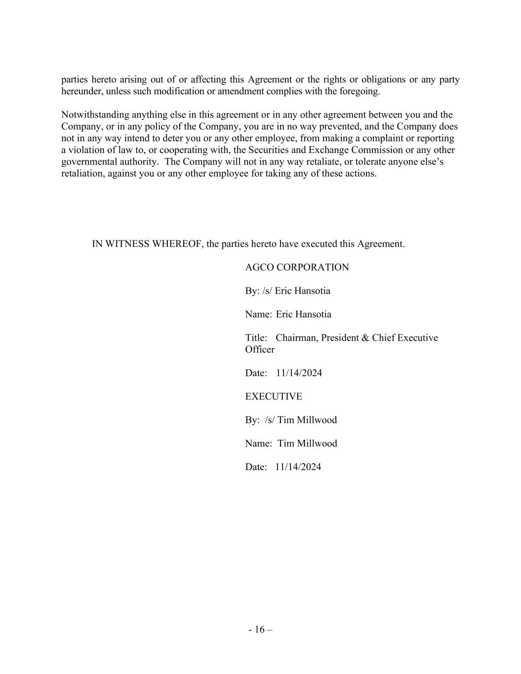 The undersigned, as the Chairman of the Board, President and Chief Executive Officer and as the Senior Vice President and Chief Financial Officer of AGCO Corporation, respectively, certify that, to the best of their knowledge and belief, the Annual Report on Form 10-K for the year ended December 31, 2024 that accompanies this certification fully complies with the requirements of Section 13(a) of the Securities Exchange Act of 1934 and the information contained in the annual report fairly presents, in all material respects, the financial condition and results of operations of AGCO Corporation at the dates and for the periods indicated. The foregoing certifications are made pursuant to 906 of the Sarbanes-Oxley Act of 2002 (18 U.S.C. 1350) and shall not be relied upon for any other purpose.