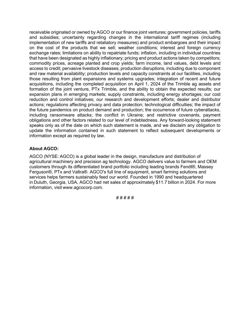receivable originated or owned by AGCO or our finance joint ventures; government policies, tariffs and subsidies; uncertainty regarding changes in the international tariff regimes (including implementation of new tariffs and retaliatory measures) and product embargoes and their impact on the cost of the products that we sell; weather conditions; interest and foreign currency exchange rates; limitations on ability to repatriate funds; inflation, including in individual countries that have been designated as highly inflationary; pricing and product actions taken by competitors; commodity prices, acreage planted and crop yields; farm income, land values, debt levels and access to credit; pervasive livestock diseases; production disruptions, including due to component and raw material availability; production levels and capacity constraints at our facilities, including those resulting from plant expansions and systems upgrades; integration of recent and future acquisitions, including the completed acquisition on April 1, 2024 of the Trimble ag assets and formation of the joint venture, PTx Trimble, and the ability to obtain the expected results; our expansion plans in emerging markets; supply constraints, including energy shortages; our cost reduction and control initiatives; our research and development efforts; dealer and distributor actions; regulations affecting privacy and data protection; technological difficulties; the impact of the future pandemics on product demand and production; the occurrence of future cyberattacks, including ransomware attacks; the conflict in Ukraine; and restrictive covenants, payment obligations and other factors related to our level of indebtedness. Any forward-looking statement speaks only as of the date on which such statement is made, and we disclaim any obligation to update the information contained in such statement to reflect subsequent developments or information except as required by law. About AGCO: AGCO (NYSE: AGCO) is a global leader in the design, manufacture and distribution of agricultural machinery and precision ag technology. AGCO delivers value to farmers and OEM customers through its differentiated brand portfolio including leading brands Fendt®, Massey Ferguson®, PTx and Valtra®. AGCO's full line of equipment, smart farming solutions and services helps farmers sustainably feed our world. Founded in 1990 and headquartered in Duluth, Georgia, USA, AGCO had net sales of approximately $11.7 billion in 2024. For more information, visit www.agcocorp.com. # # # # #