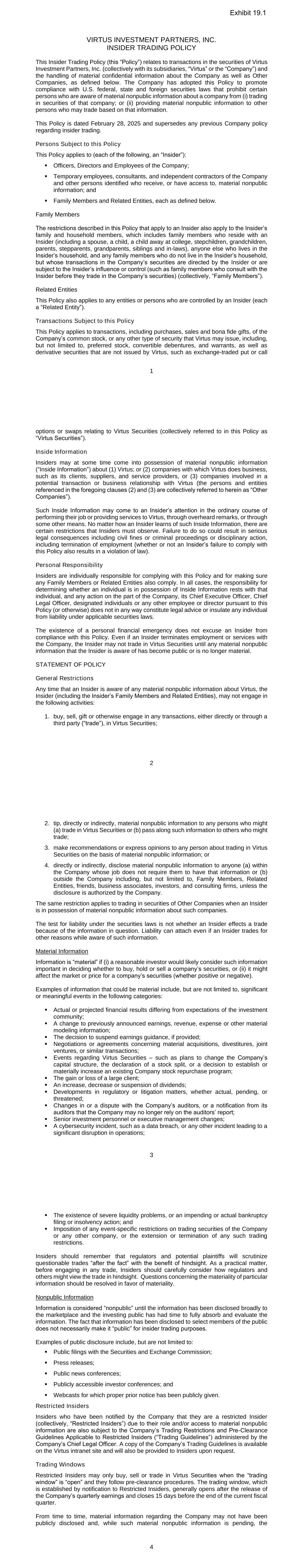 1 VIRTUS INVESTMENT PARTNERS, INC. INSIDER TRADING POLICY This Insider Trading Policy (this “Policy”) relates to transactions in the securities of Virtus Investment Partners, Inc. (collectively with its subsidiaries, “Virtus” or the “Company”) and the handling of material confidential information about the Company as well as Other Companies, as defined below. The Company has adopted this Policy to promote compliance with U.S. federal, state and foreign securities laws that prohibit certain persons who are aware of material nonpublic information about a company from (i) trading in securities of that company; or (ii) providing material nonpublic information to other persons who may trade based on that information. This Policy is dated February 28, 2025 and supersedes any previous Company policy regarding insider trading. Persons Subject to this Policy This Policy applies to (each of the following, an “Insider”): ▪ Officers, Directors and Employees of the Company; ▪ Temporary employees, consultants, and independent contractors of the Company and other persons identified who receive, or have access to, material nonpublic information; and ▪ Family Members and Related Entities, each as defined below. Family Members The restrictions described in this Policy that apply to an Insider also apply to the Insider’s family and household members, which includes family members who reside with an Insider (including a spouse, a child, a child away at college, stepchildren, grandchildren, parents, stepparents, grandparents, siblings and in-laws), anyone else who lives in the Insider’s household, and any family members who do not live in the Insider’s household, but whose transactions in the Company’s securities are directed by the Insider or are subject to the Insider’s influence or control (such as family members who consult with the Insider before they trade in the Company’s securities) (collectively, “Family Members”). Related Entities This Policy also applies to any entities or persons who are controlled by an Insider (each a “Related Entity”). Transactions Subject to this Policy This Policy applies to transactions, including purchases, sales and bona fide gifts, of the Company’s common stock, or any other type of security that Virtus may issue, including, but not limited to, preferred stock, convertible debentures, and warrants, as well as derivative securities that are not issued by Virtus, such as exchange-traded put or call Exhibit 19.1 2 options or swaps relating to Virtus Securities (collectively referred to in this Policy as “Virtus Securities”). Inside Information Insiders may at some time come into possession of material nonpublic information (“Inside Information”) about (1) Virtus; or (2) companies with which Virtus does business, such as its clients, suppliers, and service providers, or (3) companies involved in a potential transaction or business relationship with Virtus (the persons and entities referenced in the foregoing clauses (2) and (3) are collectively referred to herein as “Other Companies”). Such Inside Information may come to an Insider’s attention in the ordinary course of performing their job or providing services to Virtus, through overheard remarks, or through some other means. No matter how an Insider learns of such Inside Information, there are certain restrictions that Insiders must observe. Failure to do so could result in serious legal consequences including civil fines or criminal proceedings or disciplinary action, including termination of employment (whether or not an Insider’s failure to comply with this Policy also results in a violation of law). Personal Responsibility Insiders are individually responsible for complying with this Policy and for making sure any Family Members or Related Entities also comply. In all cases, the responsibility for determining whether an individual is in possession of Inside Information rests with that individual, and any action on the part of the Company, its Chief Executive Officer, Chief Legal Officer, designated individuals or any other employee or director pursuant to this Policy (or otherwise) does not in any way constitute legal advice or insulate any individual from liability under applicable securities laws. The existence of a personal financial emergency does not excuse an Insider from compliance with this Policy. Even if an Insider terminates employment or services with the Company, the Insider may not trade in Virtus Securities until any material nonpublic information that the Insider is aware of has become public or is no longer material. STATEMENT OF POLICY General Restrictions Any time that an Insider is aware of any material nonpublic information about Virtus, the Insider (including the Insider’s Family Members and Related Entities), may not engage in the following activities: 1. buy, sell, gift or otherwise engage in any transactions, either directly or through a third party (“trade”), in Virtus Securities; 3 2. tip, directly or indirectly, material nonpublic information to any persons who might (a) trade in Virtus Securities or (b) pass along such information to others who might trade; 3. make recommendations or express opinions to any person about trading in Virtus Securities on the basis of material nonpublic information; or 4. directly or indirectly, disclose material nonpublic information to anyone (a) within the Company whose job does not require them to have that information or (b) outside the Company including, but not limited to, Family Members, Related Entities, friends, business associates, investors, and consulting firms, unless the disclosure is authorized by the Company. The same restriction applies to trading in securities of Other Companies when an Insider is in possession of material nonpublic information about such companies. The test for liability under the securities laws is not whether an Insider effects a trade because of the informa