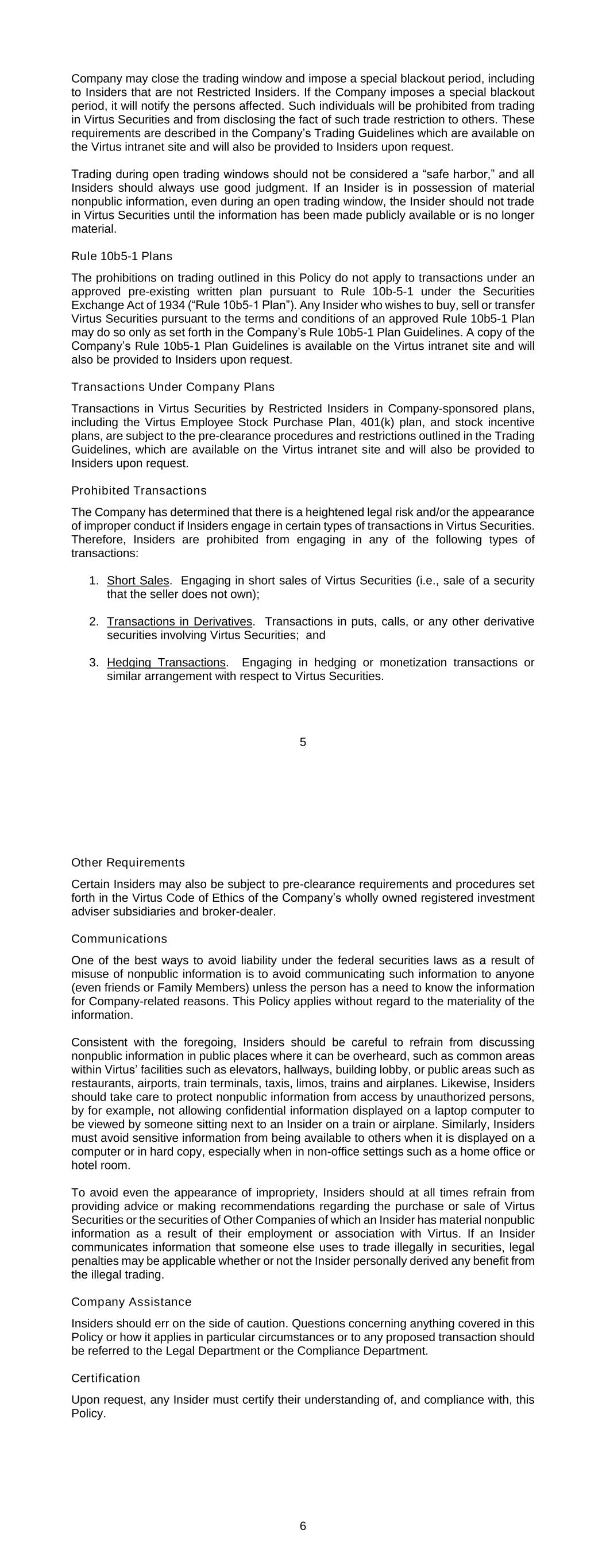 5 Company may close the trading window and impose a special blackout period, including to Insiders that are not Restricted Insiders. If the Company imposes a special blackout period, it will notify the persons affected. Such individuals will be prohibited from trading in Virtus Securities and from disclosing the fact of such trade restriction to others. These requirements are described in the Company’s Trading Guidelines which are available on the Virtus intranet site and will also be provided to Insiders upon request. Trading during open trading windows should not be considered a “safe harbor,” and all Insiders should always use good judgment. If an Insider is in possession of material nonpublic information, even during an open trading window, the Insider should not trade in Virtus Securities until the information has been made publicly available or is no longer material. Rule 10b5-1 Plans The prohibitions on trading outlined in this Policy do not apply to transactions under an approved pre-existing written plan pursuant to Rule 10b-5-1 under the Securities Exchange Act of 1934 (“Rule 10b5-1 Plan”). Any Insider who wishes to buy, sell or transfer Virtus Securities pursuant to the terms and conditions of an approved Rule 10b5-1 Plan may do so only as set forth in the Company’s Rule 10b5-1 Plan Guidelines. A copy of the Company’s Rule 10b5-1 Plan Guidelines is available on the Virtus intranet site and will also be provided to Insiders upon request. Transactions Under Company Plans Transactions in Virtus Securities by Restricted Insiders in Company-sponsored plans, including the Virtus Employee Stock Purchase Plan, 401(k) plan, and stock incentive plans, are subject to the pre-clearance procedures and restrictions outlined in the Trading Guidelines, which are available on the Virtus intranet site and will also be provided to Insiders upon request. Prohibited Transactions The Company has determined that there is a heightened legal risk and/or the appearance of improper conduct if Insiders engage in certain types of transactions in Virtus Securities. Therefore, Insiders are prohibited from engaging in any of the following types of transactions: 1. Short Sales. Engaging in short sales of Virtus Securities (i.e., sale of a security that the seller does not own); 2. Transactions in Derivatives. Transactions in puts, calls, or any other derivative securities involving Virtus Securities; and 3. Hedging Transactions. Engaging in hedging or monetization transactions or similar arrangement with respect to Virtus Securities. 6 Other Requirements Certain Insiders may also be subject to pre-clearance requirements and procedures set forth in the Virtus Code of Ethics of the Company’s wholly owned registered investment adviser subsidiaries and broker-dealer. Communications One of the best ways to avoid liability under the federal securities laws as a result of misuse of nonpublic information is to avoid communicating such information to anyone (even friends or Family Members) unless the person has a need to know the information for Company-related reasons. This Policy applies without regard to the materiality of the information. Consistent with the foregoing, Insiders should be careful to refrain from discussing nonpublic information in public places where it can be overheard, such as common areas within Virtus’ facilities such as elevators, hallways, building lobby, or public areas such as restaurants, airports, train terminals, taxis, limos, trains and airplanes. Likewise, Insiders should take care to protect nonpublic information from access by unauthorized persons, by for example, not allowing confidential information displayed on a laptop computer to be viewed by someone sitting next to an Insider on a train or airplane. Similarly, Insiders must avoid sensitive information from being available to others when it is displayed on a computer or in hard copy, especially when in non-office settings such as a home office or hotel room. To avoid even the appearance of impropriety, Insiders should at all times refrain from providing advice or making recommendations regarding the purchase or sale of Virtus Securities or the securities of Other Companies of which an Insider has material nonpublic information as a result of their employment or association with Virtus. If an Insider communicates information that someone else uses to trade illegally in securities, legal penalties may be applicable whether or not the Insider personally derived any benefit from the illegal trading. Company Assistance Insiders should err on the side of caution. Questions concerning anything covered in this Policy or how it applies in particular circumstances or to any proposed transaction should be referred to the Legal Department or the Compliance Department. Certification Upon request, any Insider must certify their understanding of, and compliance with, this Policy.