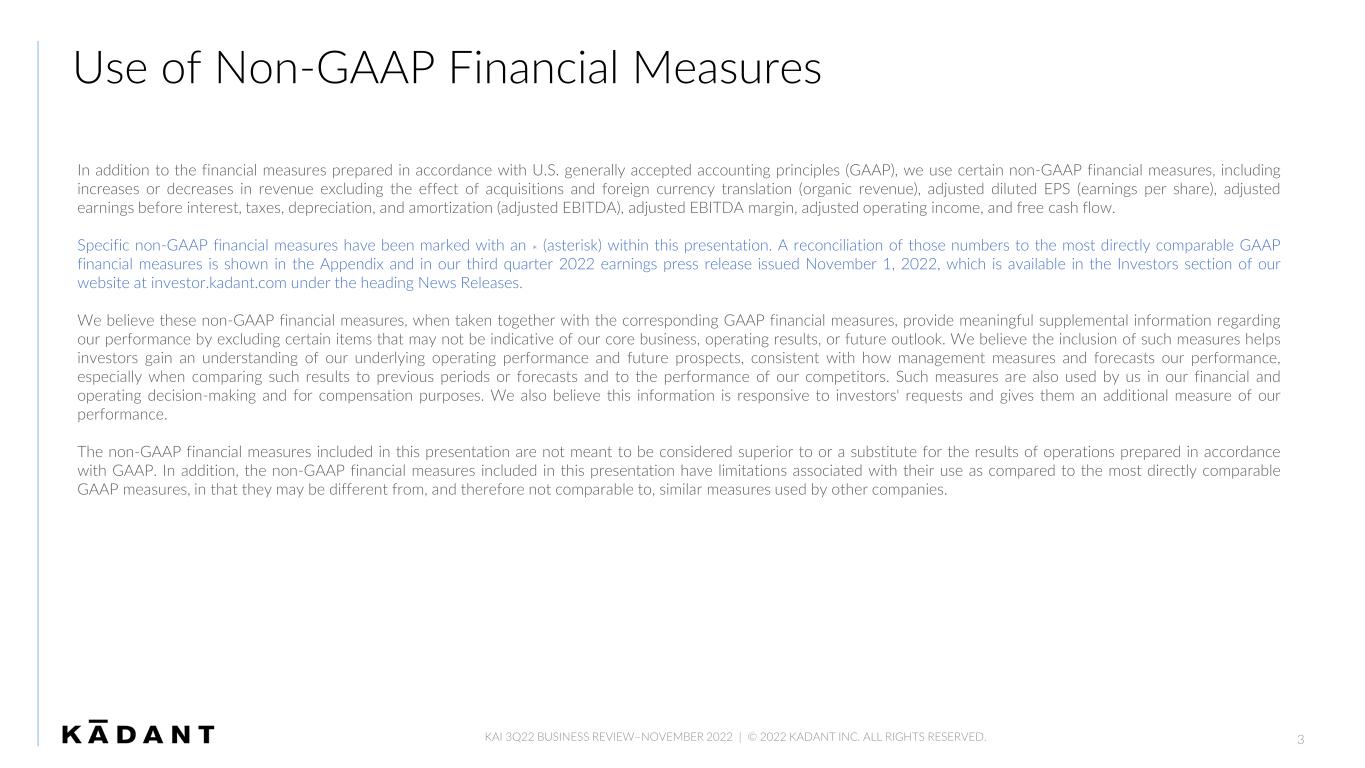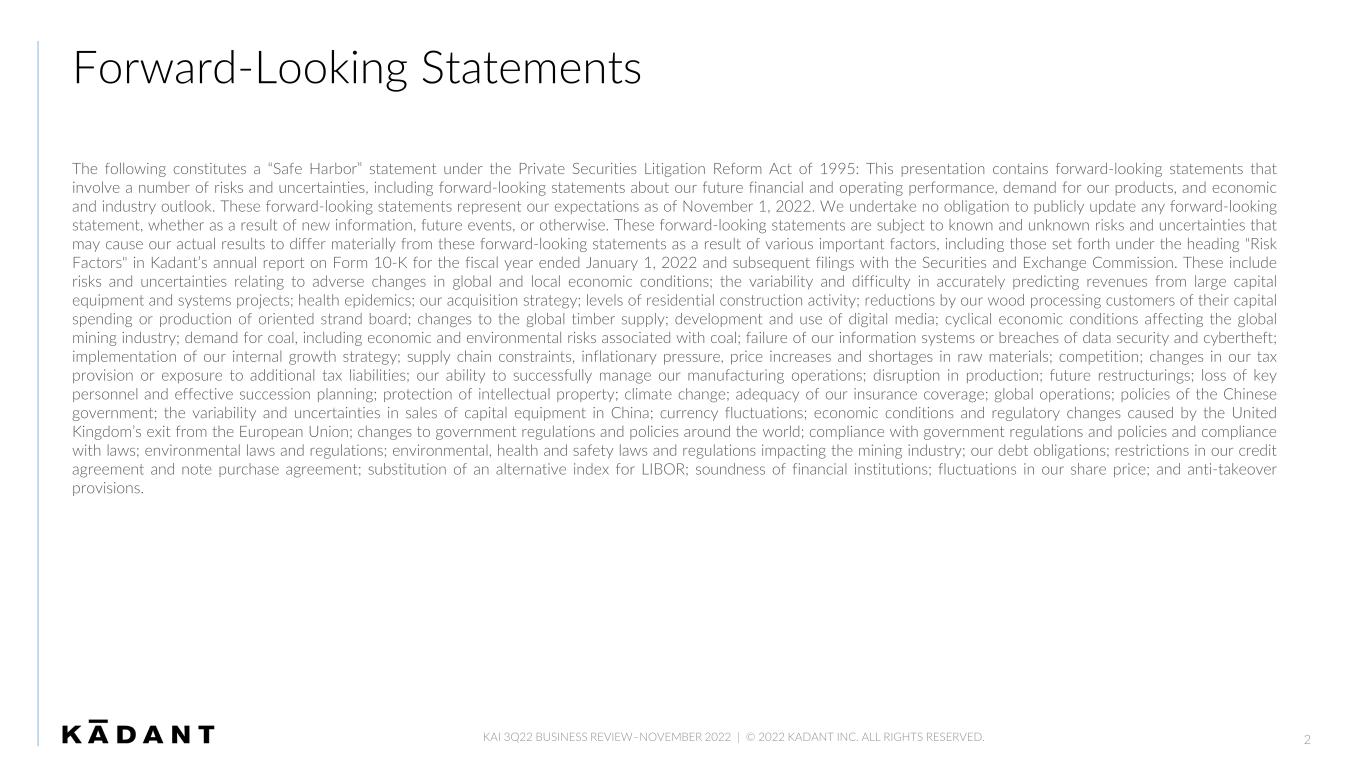 The following constitutes a “Safe Harbor” statement under the Private Securities Litigation Reform Act of 1995: This press release contains forward-looking statements that involve a number of risks and uncertainties, including forward-looking statements about our future financial and operating performance, demand for our products, and economic and industry outlook. These forward-looking statements represent our expectations as of the date of this press release. We undertake no obligation to publicly update any forward-looking statement, whether as a result of new information, future events, or otherwise. These forward-looking statements are subject to known and unknown risks and uncertainties that may cause our actual results to differ materially from these forward-looking statements as a result of various important factors, including those set forth under the heading "Risk Factors" in Kadant’s annual report on Form 10-K for the fiscal year ended January 1, 2022 and subsequent filings with the Securities and Exchange Commission. These include risks and uncertainties relating to adverse changes in global and local economic conditions; the variability and difficulty in accurately predicting revenues from large capital equipment and systems projects; health epidemics; our acquisition strategy; levels of residential construction activity; reductions by our wood processing customers of their capital spending or production of oriented strand board; changes to the global timber supply; development and use of digital media; cyclical economic conditions affecting the global mining industry; demand for coal, including economic and environmental risks associated with coal; failure of our information systems or breaches of data security and cybertheft; implementation of our internal growth strategy; supply chain constraints, inflationary pressure, price increases and shortages in raw materials; competition; changes in our tax provision or exposure to additional tax liabilities; our ability to successfully manage our manufacturing operations; disruption in production; future restructurings; loss of key personnel and effective succession planning; protection of intellectual property; climate change; adequacy of our insurance coverage; global operations; policies of the Chinese government; the variability and uncertainties in sales of capital equipment in China; currency fluctuations; economic conditions and regulatory changes caused by the United Kingdom’s exit from the European Union; changes to government regulations and policies around the world; compliance with government regulations and policies and compliance with laws; environmental laws and regulations; environmental, health and safety laws and regulations impacting the mining industry; our debt obligations; restrictions in our credit agreement and note purchase agreement; substitution of an alternative index for LIBOR; soundness of financial institutions; fluctuations in our share price; and anti-takeover provisions.