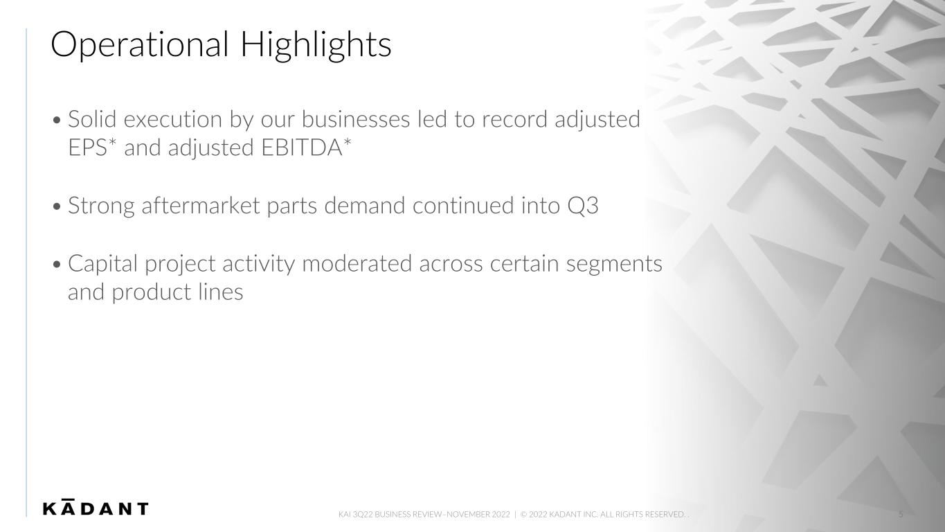 “We delivered strong revenue and earnings performance in the third quarter despite the challenging macroeconomic environment,” said Jeffrey L. Powell, president and chief executive officer of Kadant Inc. “Organic revenue growth was 19 percent in the third quarter with excellent contributions across all operating segments. Solid execution led to a fourth consecutive quarterly record for adjusted EBITDA and record adjusted earnings per share.