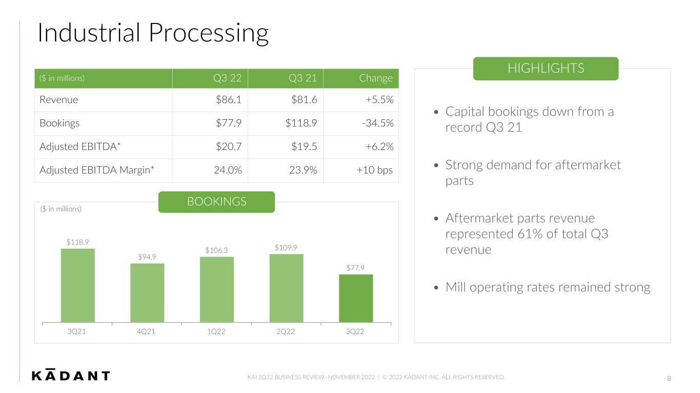 WESTFORD, Mass., November 1, 2022 - Kadant Inc. (NYSE: KAI) reported its financial results for the third quarter ended October 1, 2022.