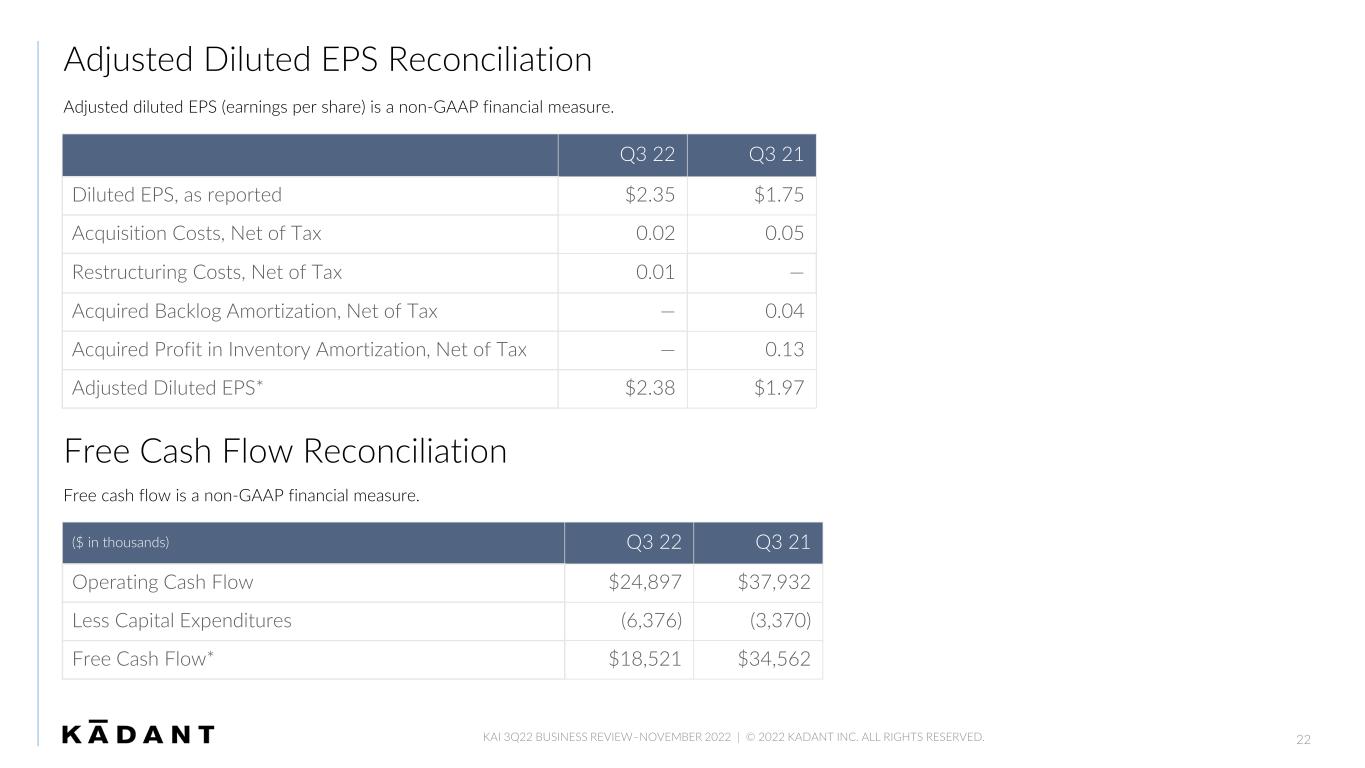 GAAP方式の希薄化後1株当たり利益(EPS)は、2021年の1.75ドルに対し、34%増の2.35ドルとなりました。調整後の希薄化後EPSは、2021年の1.97ドルに対し、21%増の2.38ドルとなり、過去最高となりました。調整後希薄化後EPSは、2022年の買収費用0.02ドル、構造改革費用0.01ドルを除外しています。調整後希薄化後EPSは、2021年の買収関連費用0.22ドルを除外しています。純利益は2021年の2050万ドルに対し、34%増の2750万ドル。調整後EBITDAは17%増の4780万ドルで、前年同期の4090万ドル、売上高比20.5%に対し、過去最高の21.3%を占めています。営業キャッシュフローは、運転資本の増加により、2021年の3790万ドルに対して34%減少し、2490万ドルとなりました。