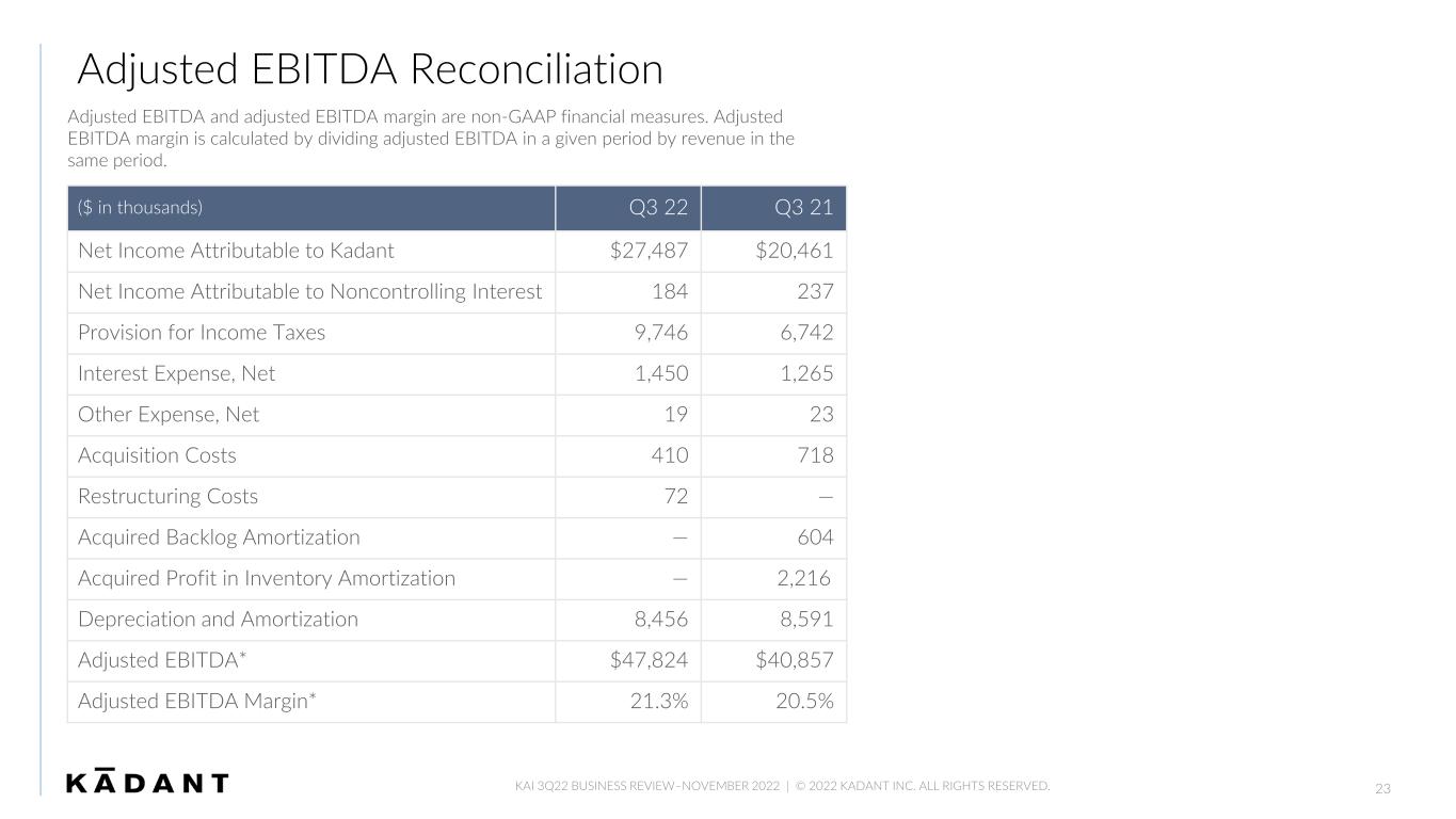 カダント・インクの社長兼CEOであるジェフリー・L・パウエルは、「厳しいマクロ経済環境にもかかわらず、当社は第3四半期に力強い収益と利益を達成しました」と述べました。「第3四半期の既存事業売上高は19%増で、すべての事業セグメントで優れた貢献を果たしました。堅調な業績により、調整後EBITDAは4四半期連続、調整後1株当たり利益も過去最高を記録しました。
