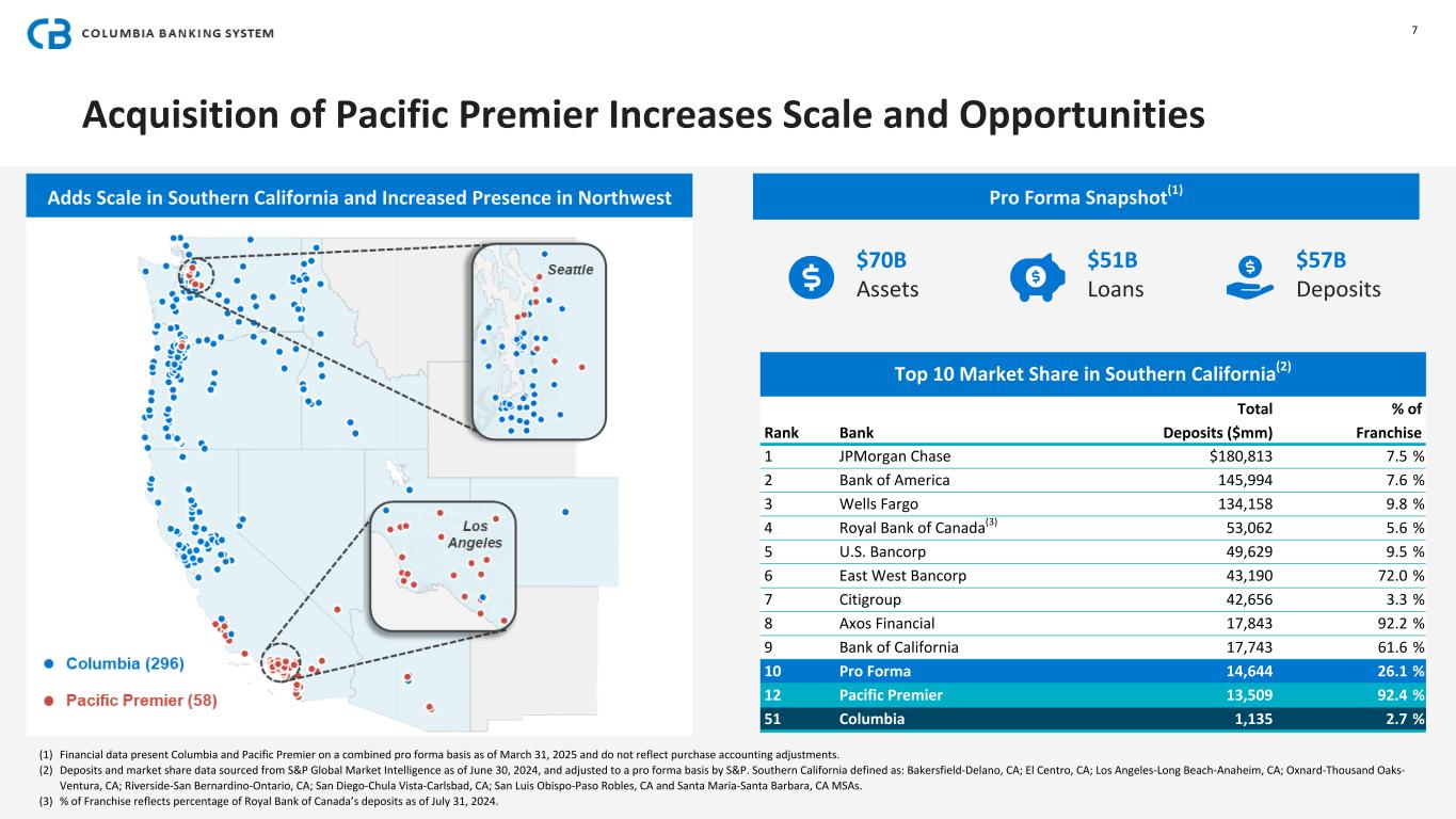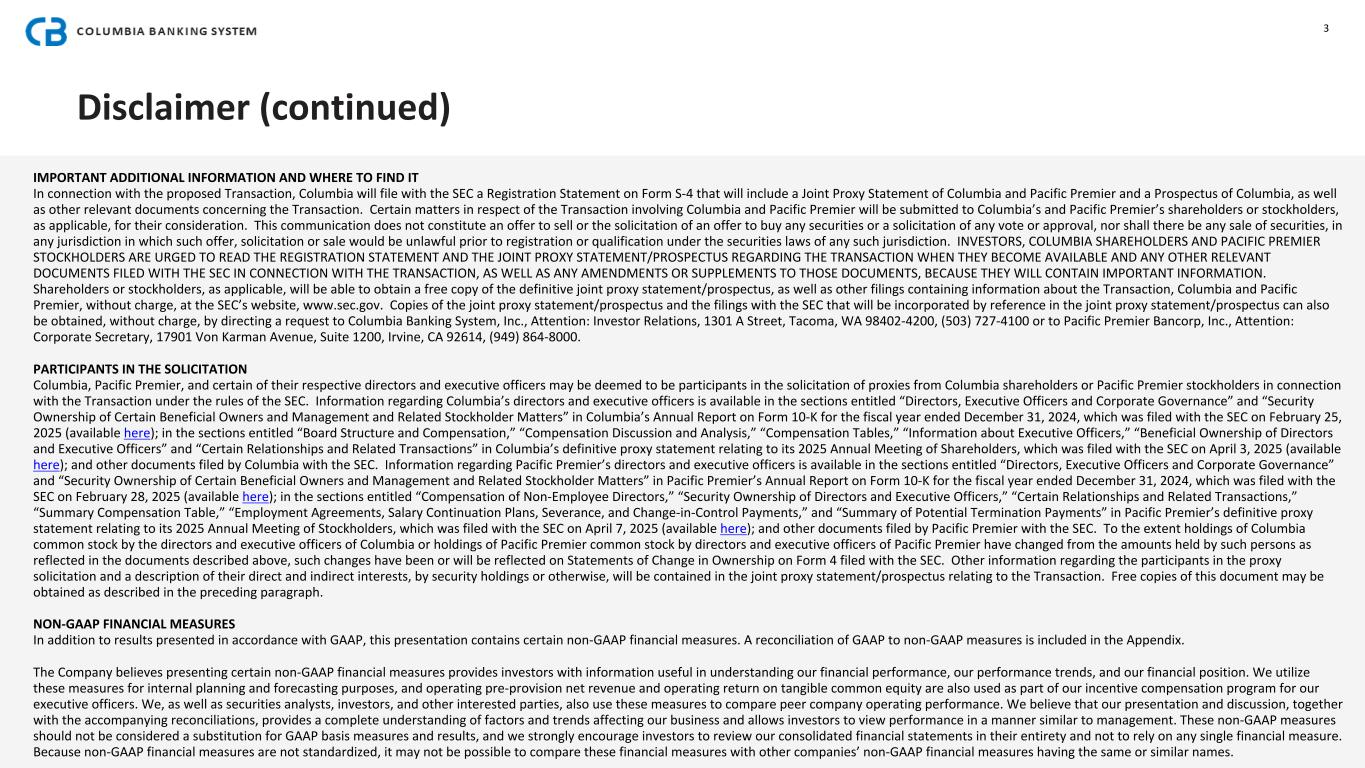 Disclaimer FORWARD-LOOKING STATEMENTS This communication may contain certain forward-looking statements, including, but not limited to, certain plans, expectations, goals, projections, and statements about the benefits of the proposed business combination transaction between Columbia Banking System, Inc. (“Columbia”) and Pacific Premier Bancorp, Inc. (“Pacific Premier”) (the “Transaction”), the plans, objectives, expectations and intentions of Columbia and Pacific Premier, the expected timing of completion of the Transaction, and other statements that are not historical facts. Such statements are subject to numerous assumptions, risks, and uncertainties. All statements other than statements of historical fact, including statements about beliefs and expectations, are forward-looking statements. Forward-looking statements may be identified by words such as “expect,” “anticipate,” “believe,” “intend,” “estimate,” “plan,” “believe,” “target,” “goal,” or similar expressions, or future or conditional verbs such as “will,” “may,” “might,” “should,” “would,” “could,” or similar variations. The forward-looking statements are intended to be subject to the safe harbor provided by Section 27A of the Securities Act of 1933, Section 21E of the Securities Exchange Act of 1934, and the Private Securities Litigation Reform Act of 1995. Although there is no assurance that any list of risks and uncertainties or risk factors is complete, below are certain factors which could cause actual results to differ materially from those contained or implied in the forward- looking statements or historical performance: changes in general economic, political, or industry conditions, and in conditions impacting the banking industry specifically; uncertainty in U.S. fiscal, monetary and trade policy, including the interest rate policies of the Federal Reserve Board or the effects of any declines in housing and commercial real estate prices, high or increasing unemployment rates, continued or renewed inflation, the impact of proposed or imposed tariffs by the U.S. government or retaliatory tariffs proposed or imposed by U.S. trading partners that could have an adverse impact on customers or any recession or slowdown in economic growth particularly in the western United States; volatility and disruptions in global capital and credit markets; the impact of bank failures or adverse developments at other banks on general investor sentiment regarding the stability and liquidity of banks; changes in interest rates that could significantly reduce net interest income and negatively affect asset yields and valuations and funding sources, including impacts on prepayment speeds; competitive pressures among financial institutions and nontraditional providers of financial services, including on product pricing and services; concentrations within Columbia’s or Pacific Premier’s loan portfolio (including commercial real estate loans), large loans to certain borrowers, and large deposits from certain clients; the success, impact, and timing of Columbia’s and Pacific Premier’s respective business strategies, including market acceptance of any new products or services and Columbia’s and Pacific Premier’s ability to successfully implement efficiency and operational excellence initiatives; the nature, extent, timing, and results of governmental actions, examinations, reviews, reforms, regulations, and interpretations; changes in laws or regulations; the occurrence of any event, change or other circumstances that could give rise to the right of one or both of the parties to terminate the merger agreement to which Columbia and Pacific Premier are parties; the outcome of any legal proceedings that may be instituted against Columbia or Pacific Premier; delays in completing the Transaction; the failure to obtain necessary regulatory approvals (and the risk that such approvals may result in the imposition of conditions that could adversely affect the combined company or the expected benefits of the Transaction); the failure to obtain shareholder or stockholder approvals, as applicable, or to satisfy any of the other conditions to the closing of the Transaction on a timely basis or at all; changes in Columbia’s or Pacific Premier’s share price before closing, including as a result of the financial performance of the other party prior to closing, or more generally due to broader stock market movements, and the performance of financial companies and peer group companies; the possibility that the anticipated benefits of the Transaction are not realized when expected or at all, including as a result of the impact of, or problems arising from, the integration of the two companies or as a result of the strength of the economy and competitive factors in the areas where Columbia and Pacific Premier do business; certain restrictions during the pendency of the proposed Transaction that may impact the parties’ ability to pursue certain business opportunities or strategic Transactions; the possibility that the Transaction may be more expensive to complete than anticipated, including as a result of unexpected factors or events; diversion of management’s attention from ongoing business operations and opportunities; potential adverse reactions or changes to business or employee relationships, including those resulting from the announcement or completion of the Transaction; the ability to complete the Transaction and integration of Columbia and Pacific Premier promptly and successfully; the dilution caused by Columbia’s issuance of additional shares of its capital stock in connection with the Transaction; and other factors that may affect the future results of Columbia and Pacific Premier. Additional factors that could cause results to differ materially from those described above can be found in Columbia’s Annual Report on Form 10-K for the year ended December 31, 2024,