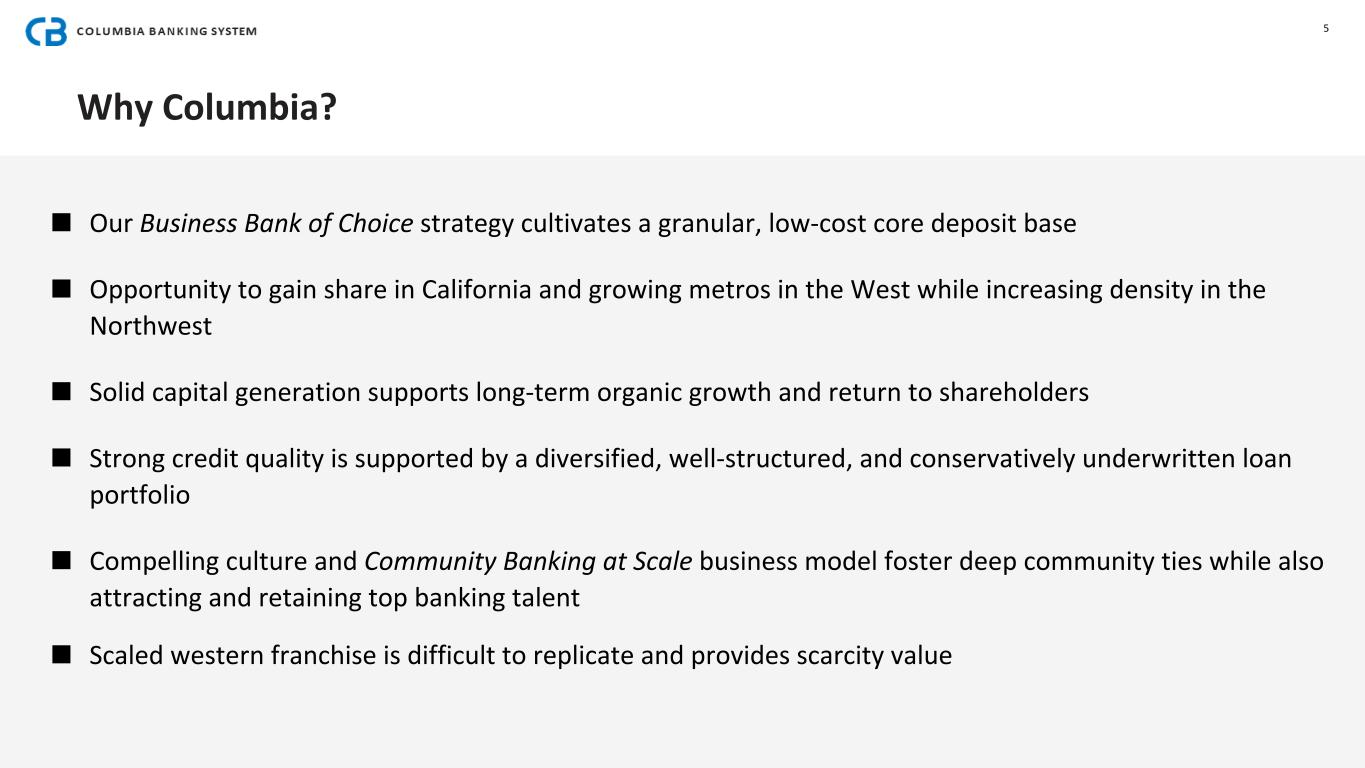 Columbia Banking System: A Franchise Like No Other 4 West-Focused Regional Powerhouse Business Bank of Choice ■ In-market, relationship-based commercial banking ■ Attractive footprint in high-growth markets ■ Full suite of deposit products and services with contemporary digital capabilities ■ Expertise in treasury management, foreign exchange, and global cash management ■ Expanding small business platform ■ Comprehensive and growing wealth advisory and trust businesses ■ Niche verticals include diverse agricultural, healthcare, tribal banking, and equipment finance Columbia at a Glance Co rp or at e Ticker COLB Headquarters Tacoma, Washington Offices ~300 in eight states Fi na nc ia ls a s of M ar ch 3 1, 2 02 5 Assets $52 billion Loans $38 billion Deposits $42 billion Common Equity Tier 1 Capital Ratio 10.6%(1) Total Capital Ratio 12.8%(1) (1) Regulatory capital ratios are estimates pending completion and filing of Columbia’s regulatory reports.