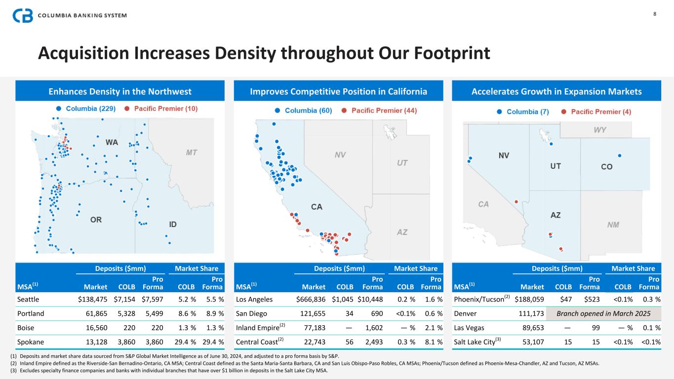 Acquisition of Pacific Premier Increases Scale and Opportunities 7 (1) Financial data present Columbia and Pacific Premier on a combined pro forma basis as of March 31, 2025 and do not reflect purchase accounting adjustments. (2) Deposits and market share data sourced from S&P Global Market Intelligence as of June 30, 2024, and adjusted to a pro forma basis by S&P. Southern California defined as: Bakersfield-Delano, CA; El Centro, CA; Los Angeles-Long Beach-Anaheim, CA; Oxnard-Thousand Oaks- Ventura, CA; Riverside-San Bernardino-Ontario, CA; San Diego-Chula Vista-Carlsbad, CA; San Luis Obispo-Paso Robles, CA and Santa Maria-Santa Barbara, CA MSAs. (3) % of Franchise reflects percentage of Royal Bank of Canada’s deposits as of July 31, 2024. Adds Scale in Southern California and Increased Presence in Northwest Top 10 Market Share in Southern California(2) Total % of Rank Bank Deposits ($mm) Franchise 1 JPMorgan Chase $180,813 7.5 % 2 Bank of America 145,994 7.6 % 3 Wells Fargo 134,158 9.8 % 4 Royal Bank of Canada(3) 53,062 5.6 % 5 U.S. Bancorp 49,629 9.5 % 6 East West Bancorp 43,190 72.0 % 7 Citigroup 42,656 3.3 % 8 Axos Financial 17,843 92.2 % 9 Bank of California 17,743 61.6 % 10 Pro Forma 14,644 26.1 % 12 Pacific Premier 13,509 92.4 % 51 Columbia 1,135 2.7 % $70B Assets $51B Loans $57B Deposits Pro Forma Snapshot(1)